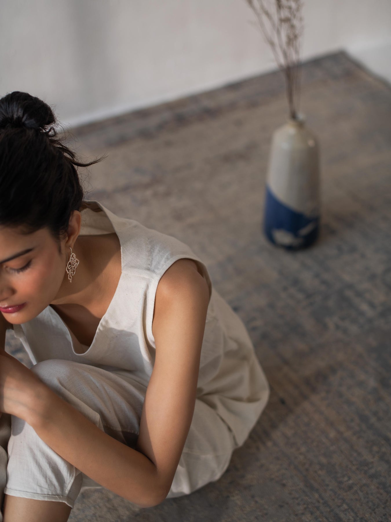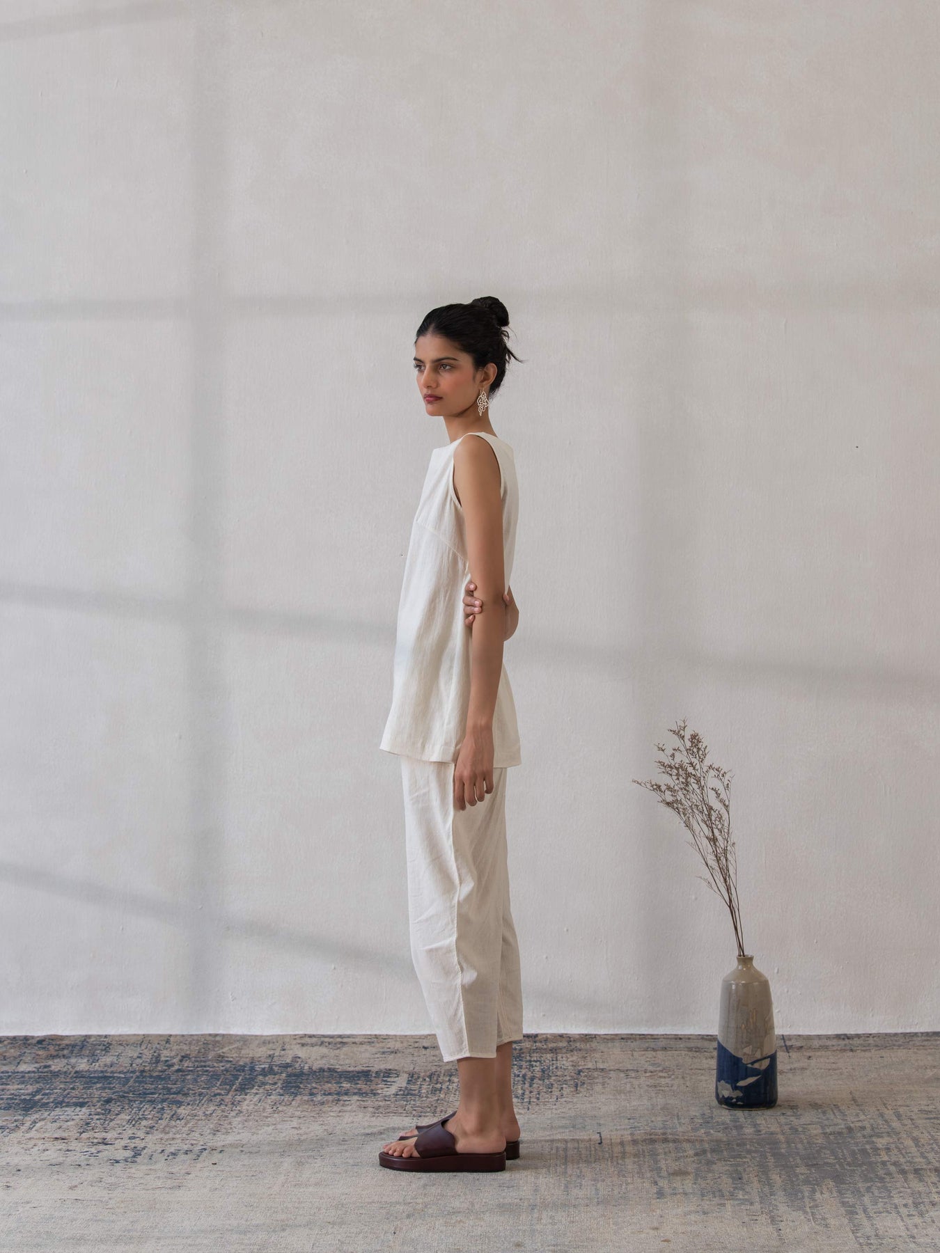 Crafted from organic khadi fabric, this sleeveless top exudes effortless style and sustainable elegance. The soft, breathable texture of khadi ensures comfort throughout the day, while the simple yet flattering cut offers a versatile foundation for countless outfits. With its lightweight design, this top is perfect for layering or wearing on its own. Pair it with high-waisted trousers for a chic, minimalistic look or combine it with your favorite skirt for a relaxed, boho-inspired ensemble. This piece is a timeless addition to any wardrobe, making a subtle yet impactful statement with its eco-conscious fabric.