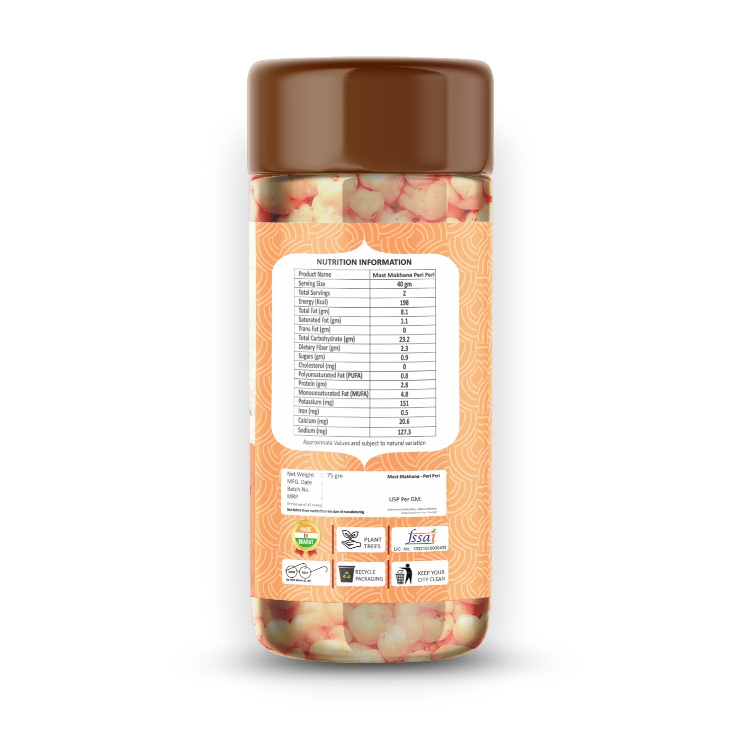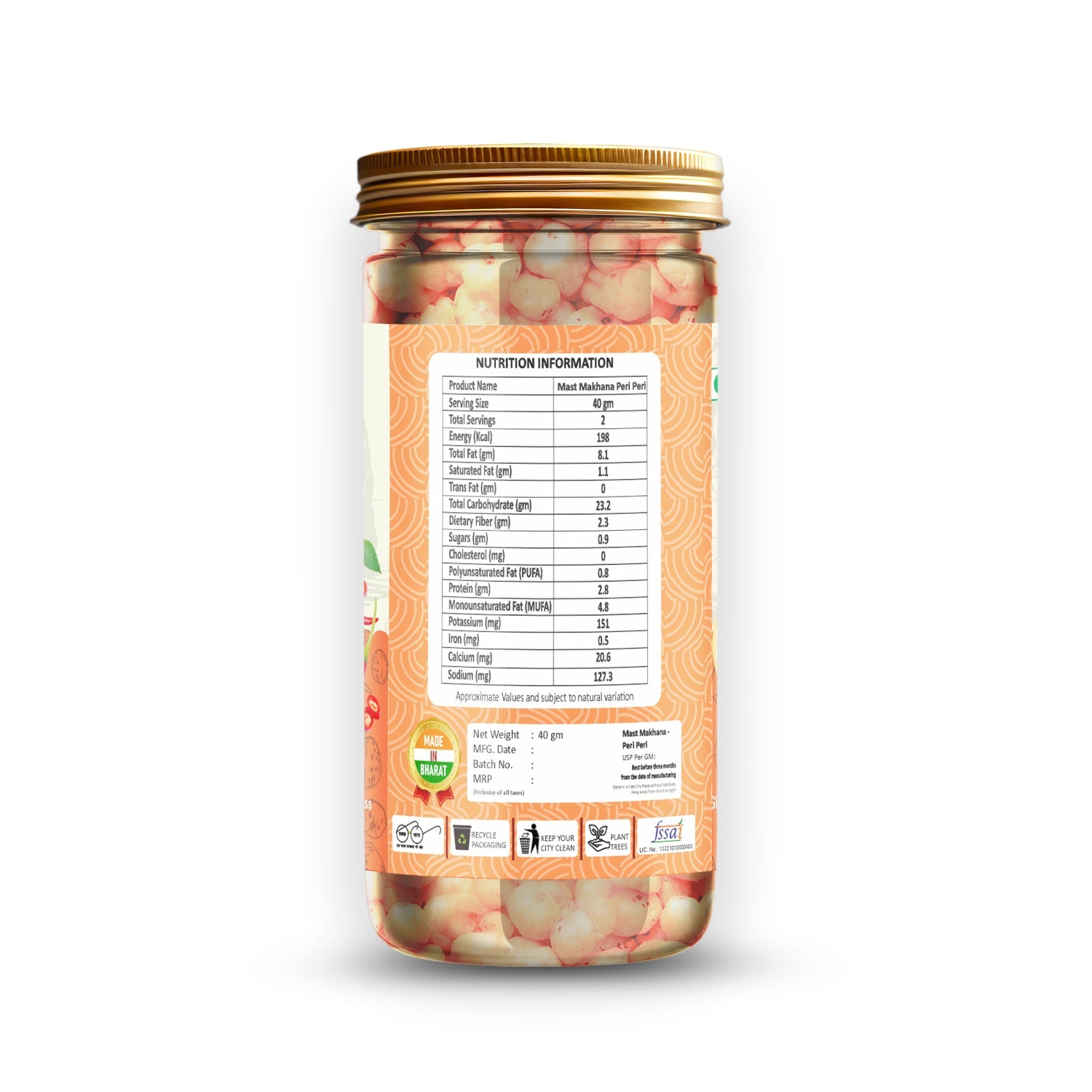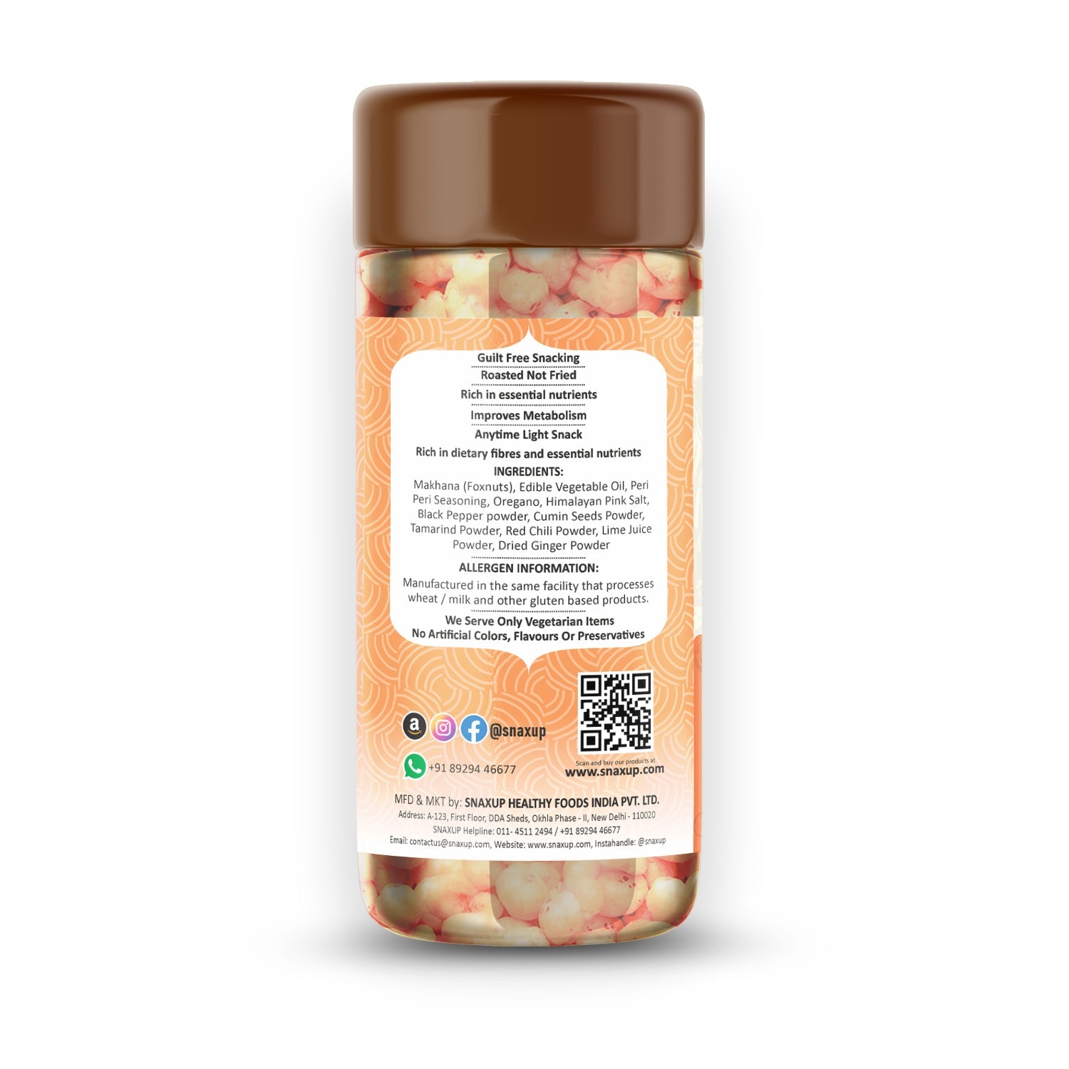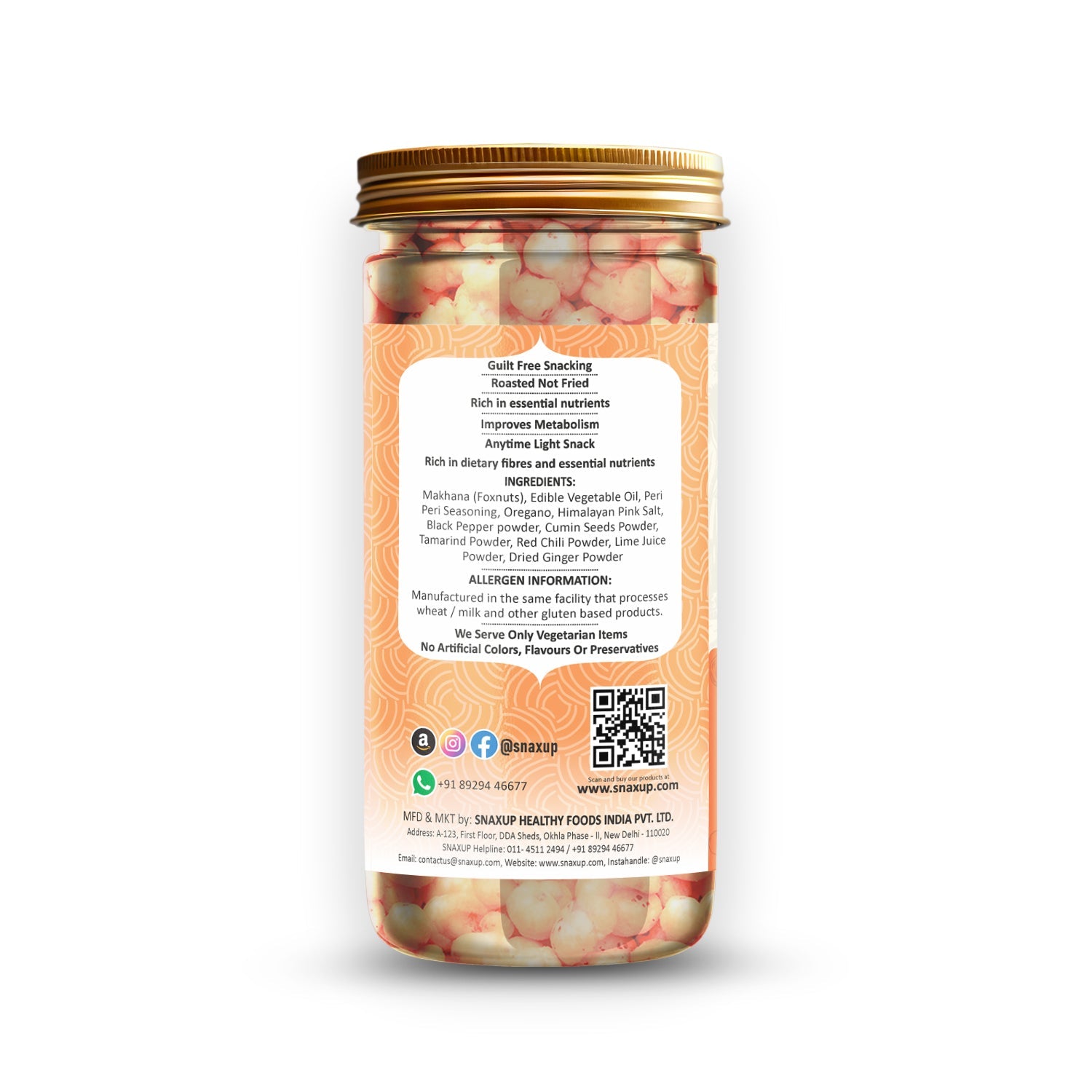 Ingredients: Makhana, Himalaya pink salt, edible vegetable oil, peri peri seasoning, black pepper powder, cumin powder, tamarid powder, red chilli powder, lime juice powder and dried ginger powder