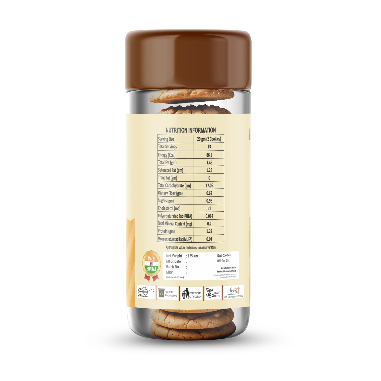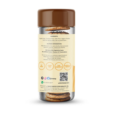 Ingredients: Organic ragi, chickpea flour, oats flour, jaggery powder, olive oil, baking soda and salt