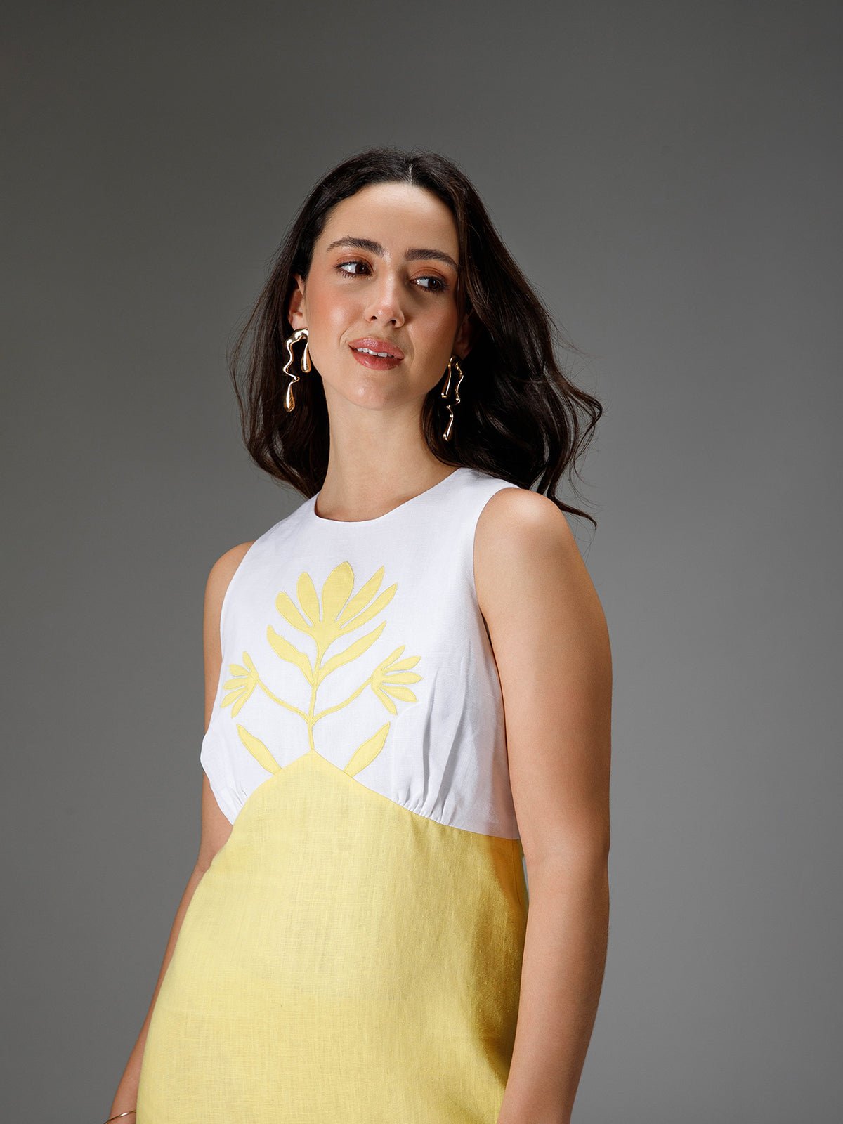 The Soleil Dress is a sun-kissed summer essential crafted from a breathable cotton-linen blend, perfect for women who adore patchwork embroidery and subtle statement details. Featuring a structured top and a relaxed hi-low hem, this dress balances modern tailoring with casual ease, offering both style and comfort for warm-weather wardrobes.