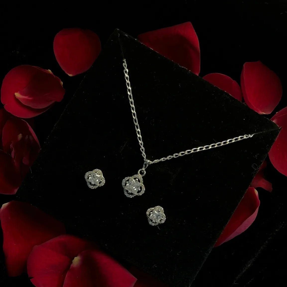 Solitaire Flower Silver Ear Ring and Pendant Set - Suspire