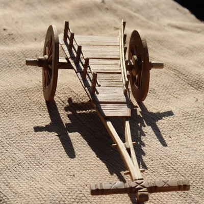Ancestral bullock cart used to carry farm produce. This rustic creation has been made entirely of 'Mes' bamboo that has been sourced locally. The creator is a craftsman expert in bamboo and coconut shell-based handicrafts. The mini cart is an example of beauty blended with technique of an actual cart with a dash of the artists personal touch. For example: the inner wheel is carved out in the shape of the holy 'Swastik' and yet the cart is perfectly balanced. Such attention to detail by its creator makes the cart an exclusive must-have in your abode. Go on bring home a bit of your native nostalgia..
