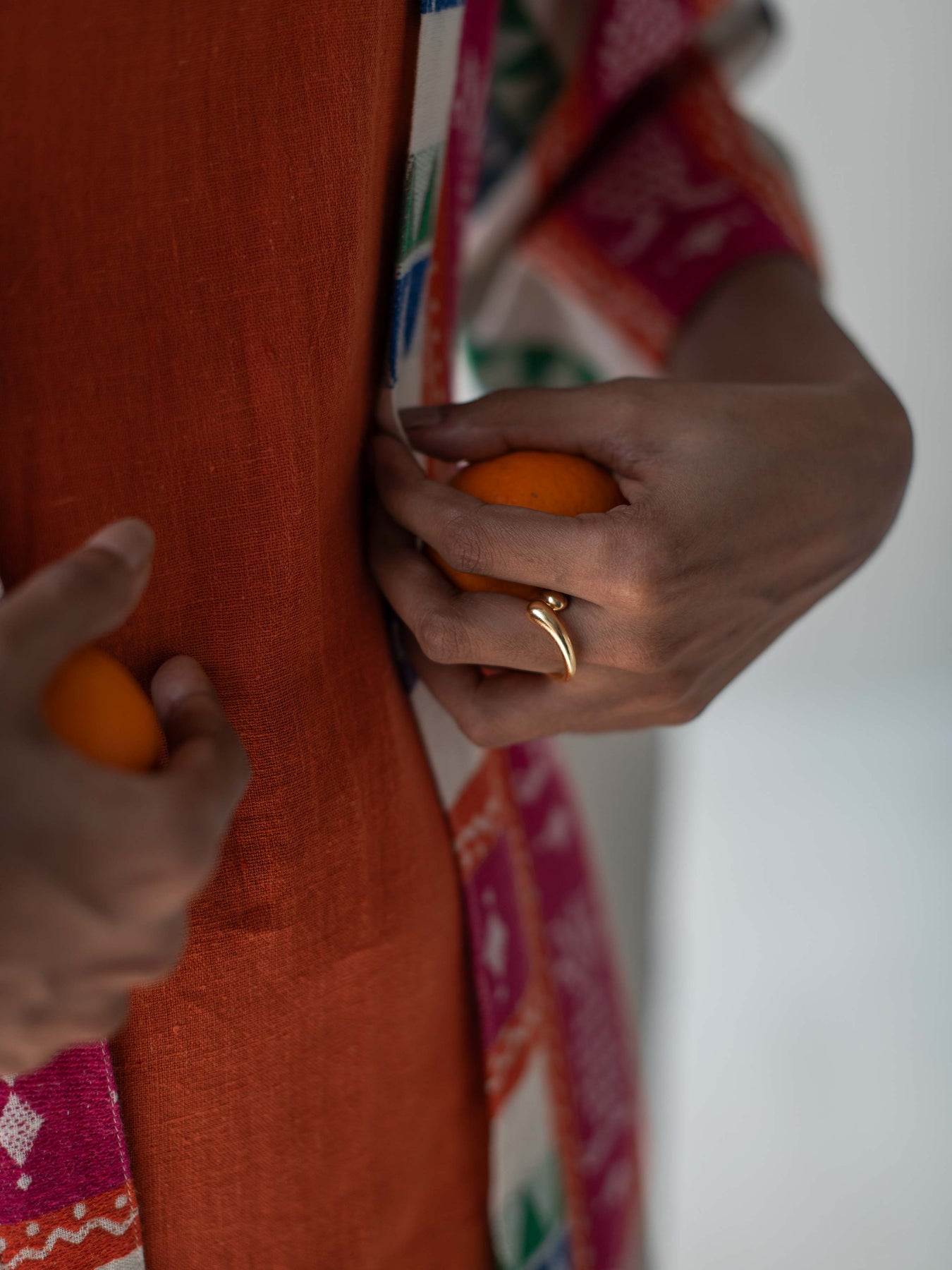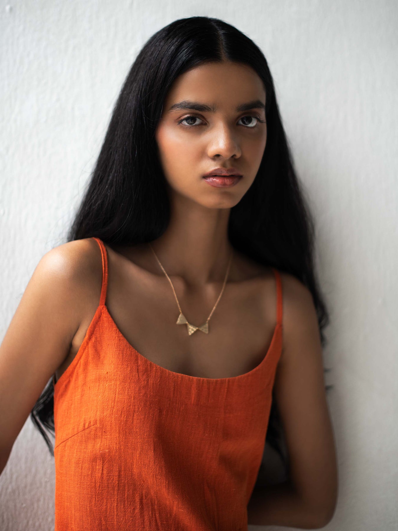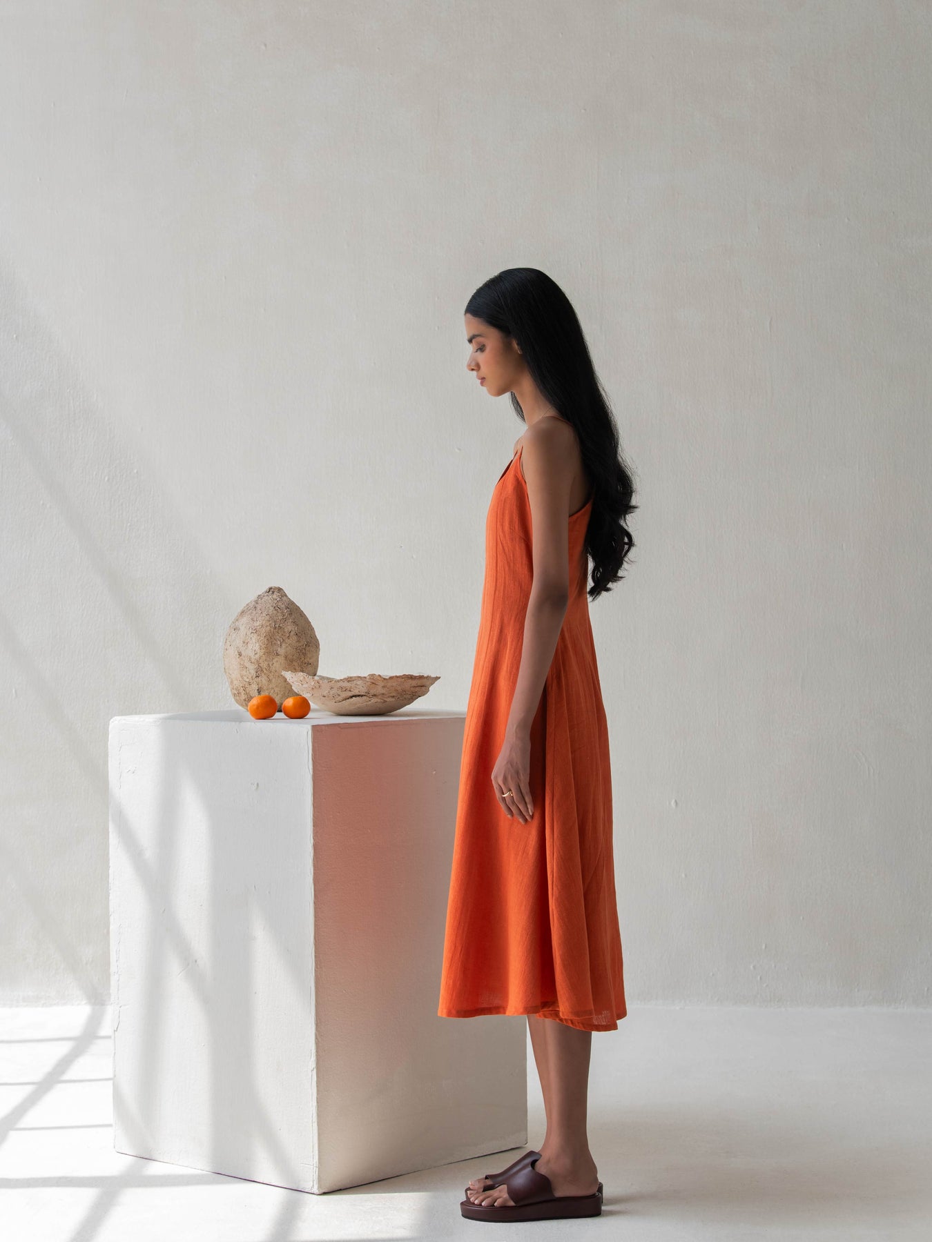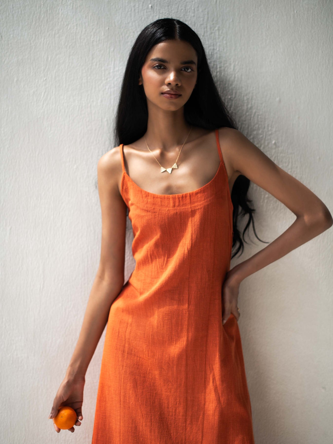 Crafted from premium organic cotton, this spaghetti strap A-line dress combines effortless style with sustainable comfort. The rich burnt orange hue, derived from organic cotton, adds a vibrant yet earthy touch to the design. The deep round neck creates a flattering neckline, while the A-line silhouette provides a relaxed, flowing fit that flatters every figure. The breathable, soft fabric ensures all-day comfort, making it perfect for warm weather or layered for cooler days. Whether for a casual outing or a laid-back evening, this dress offers versatility and conscious fashion with every wear.
