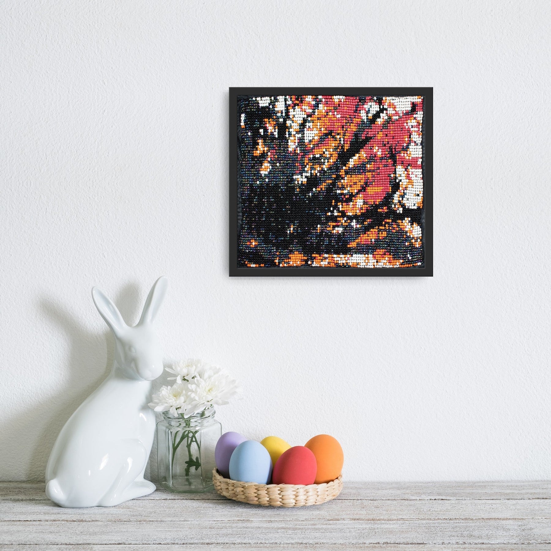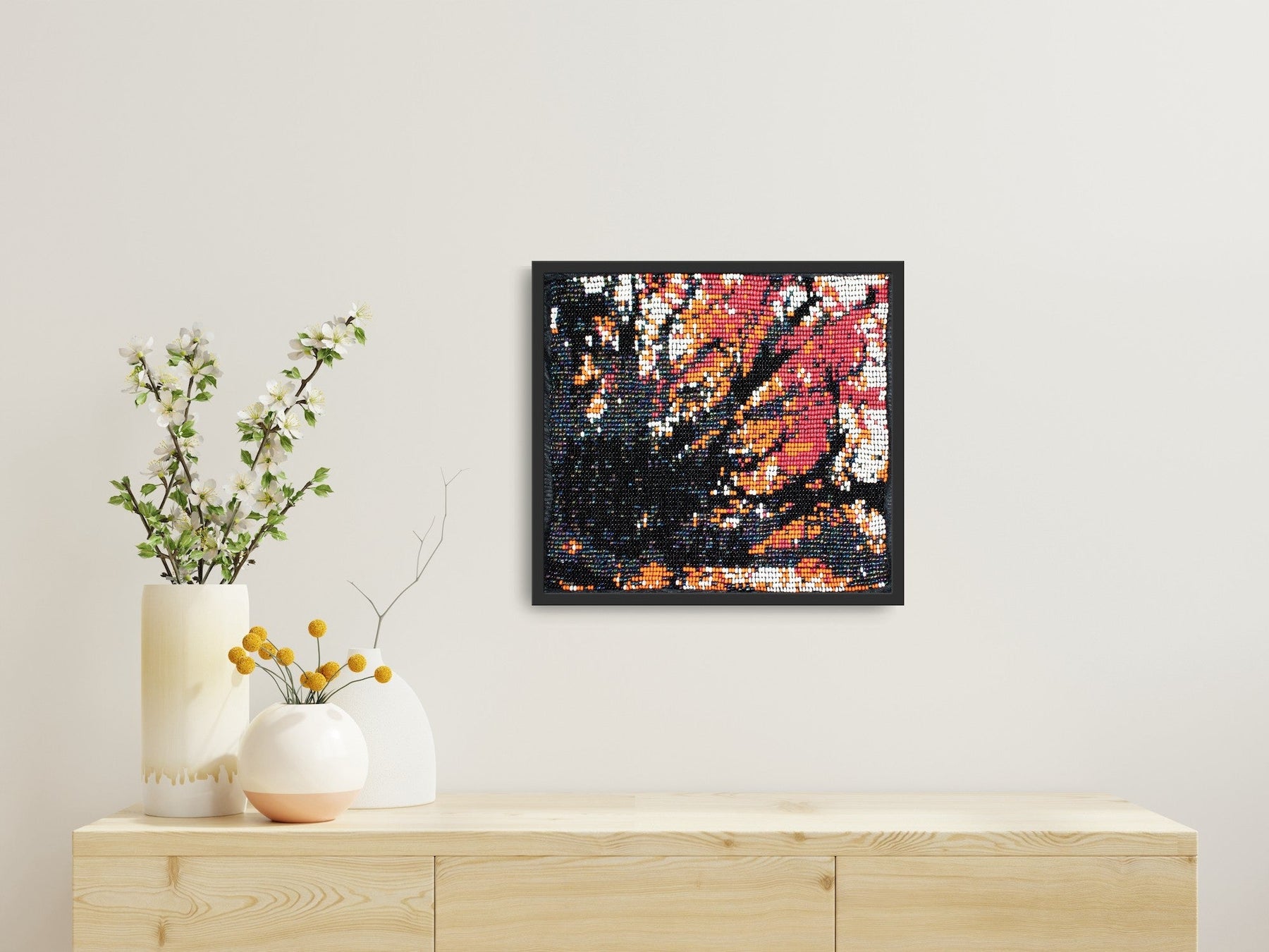 About the Collection: Handwoven on simple wooden looms by artisans in Bhavnagar, Gujarat, this piece embodies India’s fading bead-loom tradition. Tiny glass beads are woven into intricate patterns inspired by nature and geometry, preserving a craft once used to create torans that symbolized welcome and good fortune. Each artwork tells a quiet story — a meditative play of texture, light, and patience.