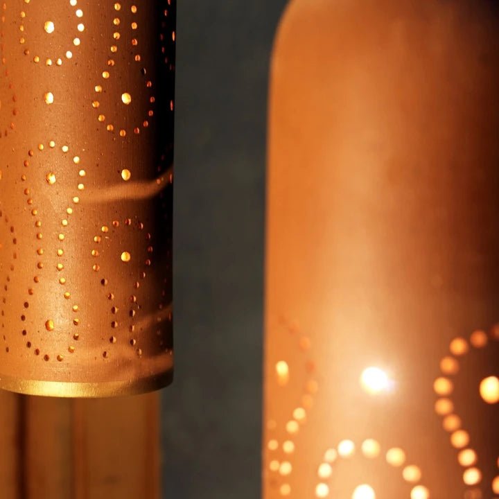 STRAW 2 is very finely touched sleek design and delicately handcrafted floral perforations creating a beautiful lighting effect. It is a terracotta decorative table light for any decor - modern, retro or even little classy fashion : this will glow with its own beauty as hanging lights. This Light can easily go on entrance, living room, balcony or any place where you wish to have a elegance by play of light and light itself. The product is designed to give you indirect light without hitting your eyes.3W surface LED is pre fitted inside the shell of STRAW, base is made of wood.