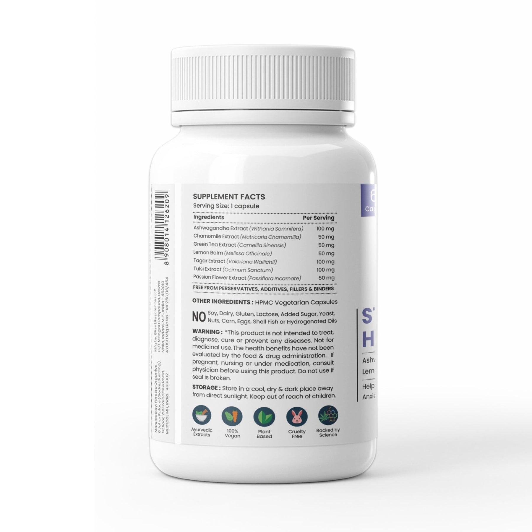 Ingredients: Ashwagandha, Chamomile, Green Tea, Lemon Balm, Tagar, Tulsi & Passion Flower