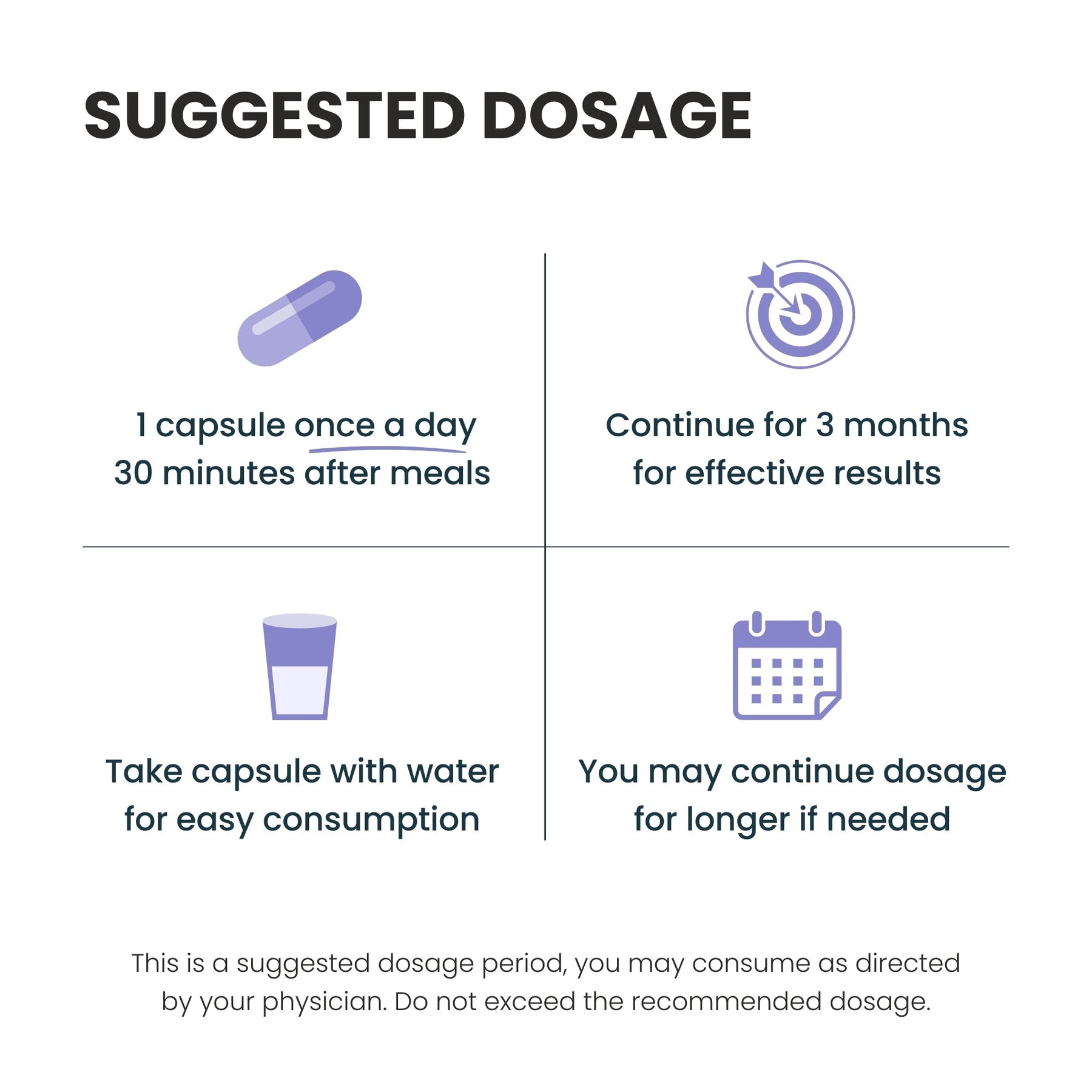 Dosage: For adults, 1 (one) capsule once a day 30 minutes after meal, or as directed by your healthcare professional. For better results, consume it daily for at least 90 days. Do not exceed the prescribed dosage.