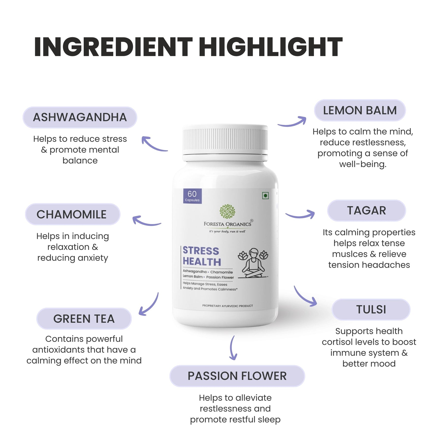 Foresta Organics' Stress Health is a 100% natural supplement helps you de-stress and feel calmer. It also helps in reducing levels of anxiety, managing mood swings and better stress tolerance and sleep quality.