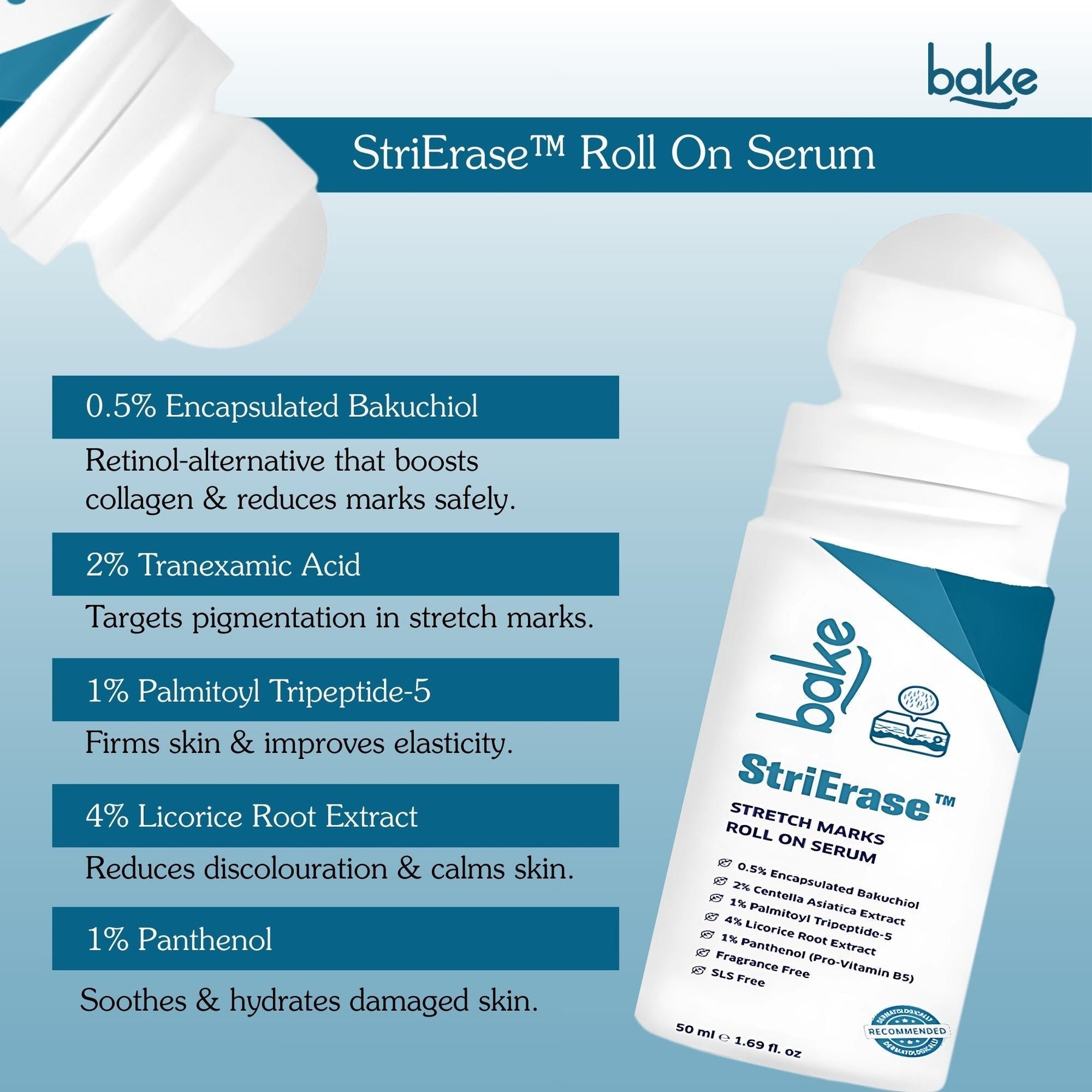 BAKE StriErase Stretch Marks Roll-On Serum is a carefully formulated treatment powered by 0.5% Encapsulated Bakuchiol, 2% Centella Asiatica, and 4% Licorice Root Extract. This lightweight serum targets both old and new stretch marks, visibly improving skin texture, elasticity, and firmness. The roll-on design allows precise and mess-free application, enhancing absorption and delivering actives directly to affected areas like hips, thighs, stomach, and arms. Bakuchiol, a natural retinol alternative, helps rebuild collagen and smooth skin without irritation. Centella Asiatica strengthens the skin barrier while Licorice Root brightens discolored marks for a more even tone. With regular use, StriErase visibly reduces the appearance of stretch marks, supports skin healing, and prevents new marks from forming. The fragrance-free and SLS-free formula is gentle enough for daily use—even for sensitive skin.