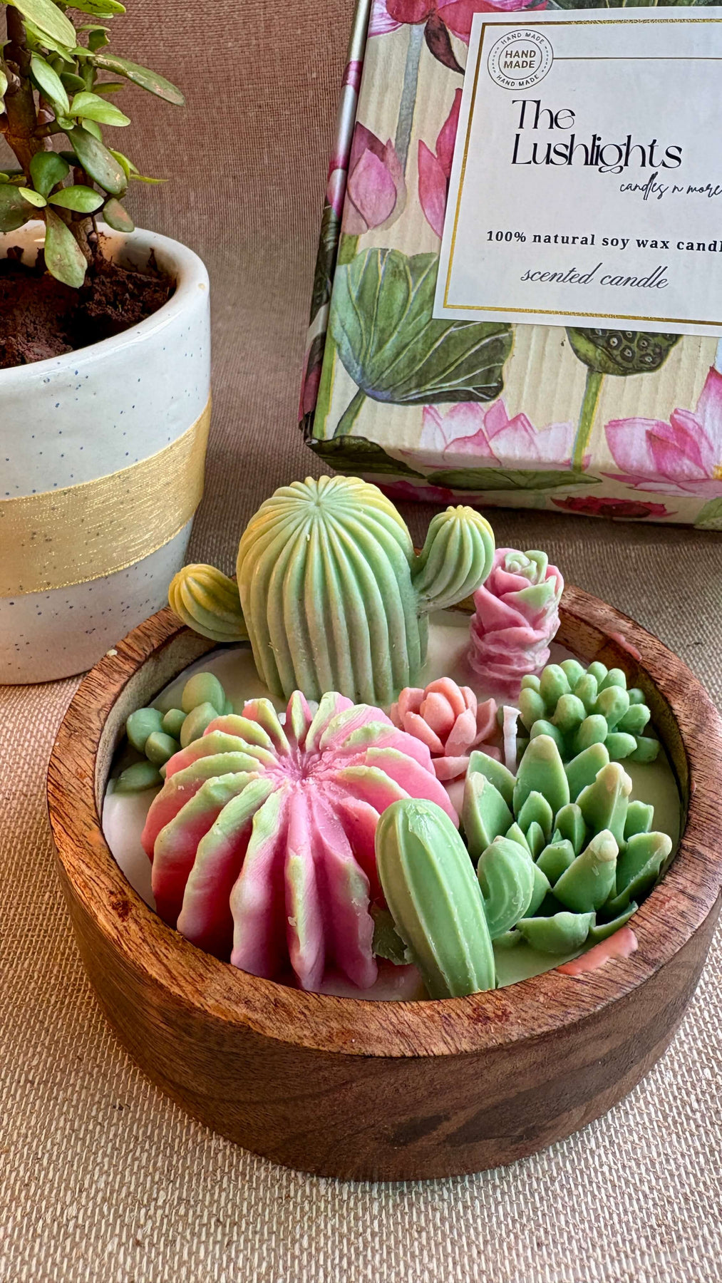 Bring the serenity of a blooming desert garden into your home with our handcrafted Succulent Candle, nestled in a rustic wooden bowl. Each wax succulent is meticulously sculpted to mimic nature’s quiet beauty, creating a centerpiece that soothes the senses and elevates your space. Durable, reusable, and easy to clean—made to last through seasons and celebrations. Once the candle has burned down, repurpose the bowl as a planter, trinket dish, or keepsake holder.