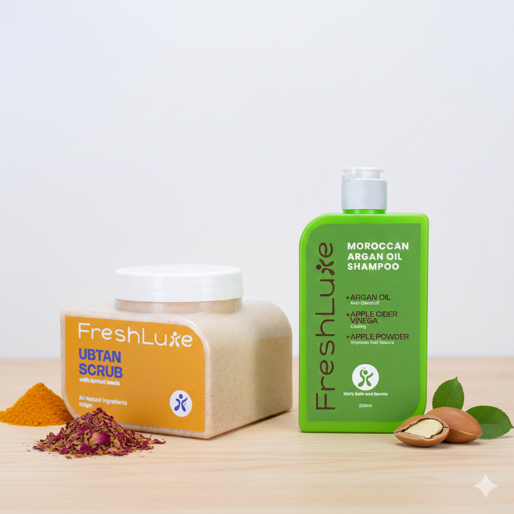 Two premium essentials for a balanced routine. Moroccan Argan Oil Shampoo nourishes and smoothens hair, while Ubtan Scrub gently polishes skin for a fresher look. Ideal for those who want quality staples at better value.