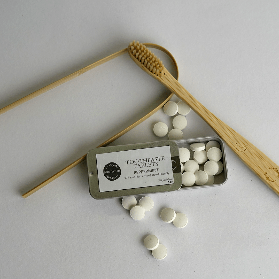 Make your oral care routine clean, conscious, and travel-ready with the Shunyam Sustainable Dental Kit. This all-in-one plastic-free set includes 30 peppermint toothpaste tablets, a soft-bristled bamboo toothbrush, and a stainless steel tongue cleaner—everything you need for a fresh start every day.