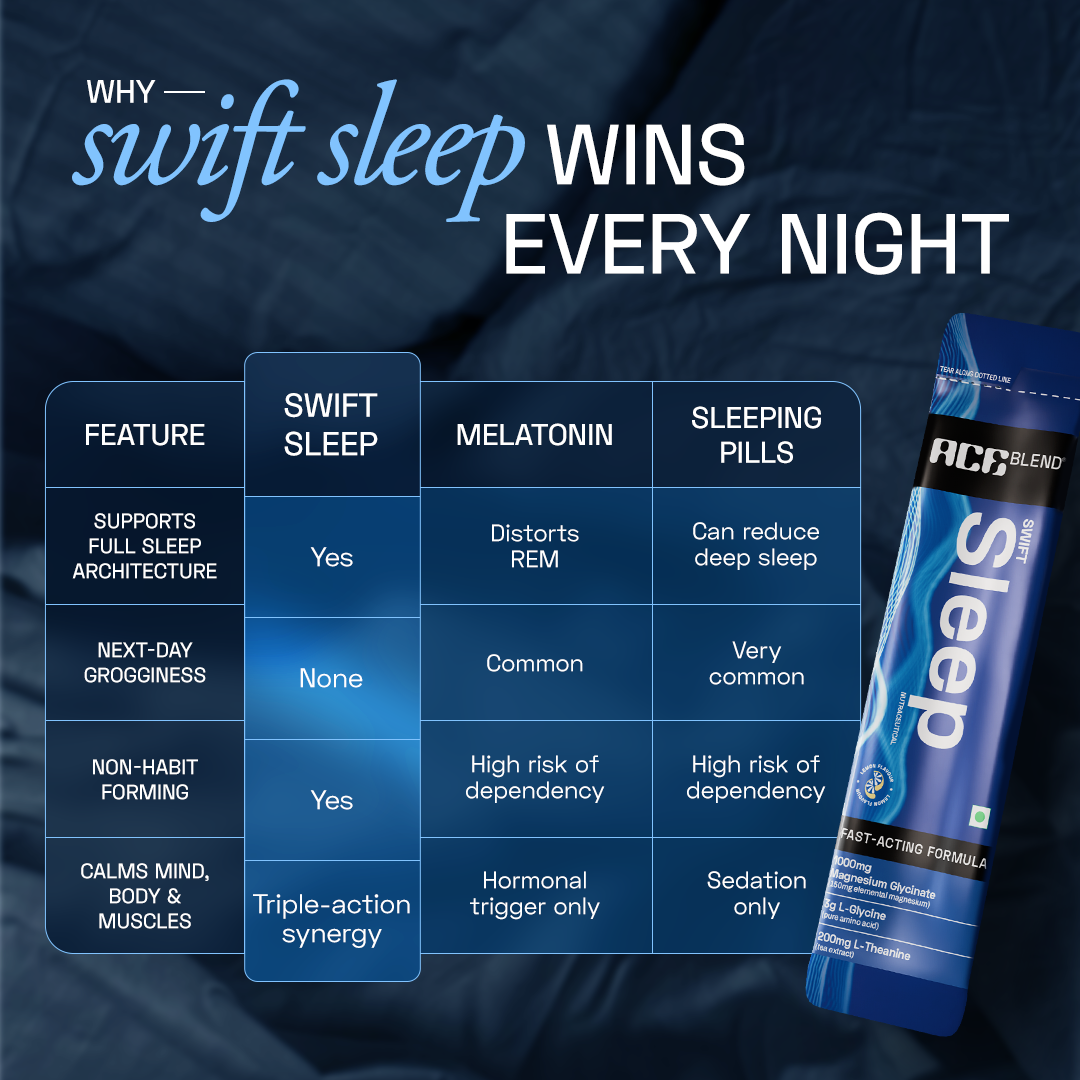 Everyone struggles with sleep in some form. Some can’t fall asleep, some wake up in the middle of the night, and most of us feel tired even after 7 hours in bed. Swift Sleep fixes the foundation of deep sleep with a fast-acting blend of magnesium glycinate, L theanine, and L glycine. Designed to help you fall asleep faster, stay asleep longer, and wake up refreshed. It comes in convenient sachets so great sleep is always in reach. At home or on your travels.