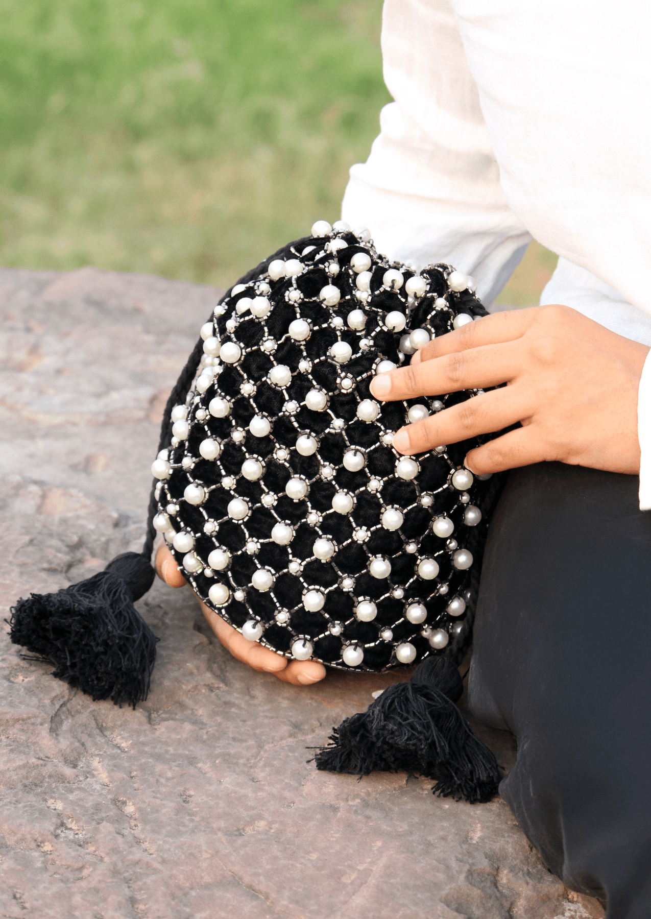 Product details: Grace in perfect balance. The symmetra potli bag is hand-embroidered with pearl-like white beads, radiating timeless charm through meticulous symmetry.