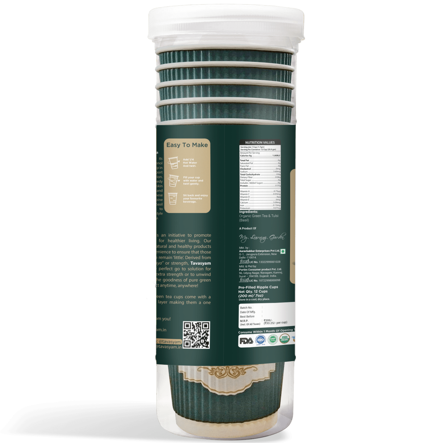 TAVASYAM Ready to Sip Tulsi Flavour Green Tea Cup - Vegan, Gluten Free & Sugar Free - Pre-Filled Tea Cups 200 ml | Tea Cups Set of 12