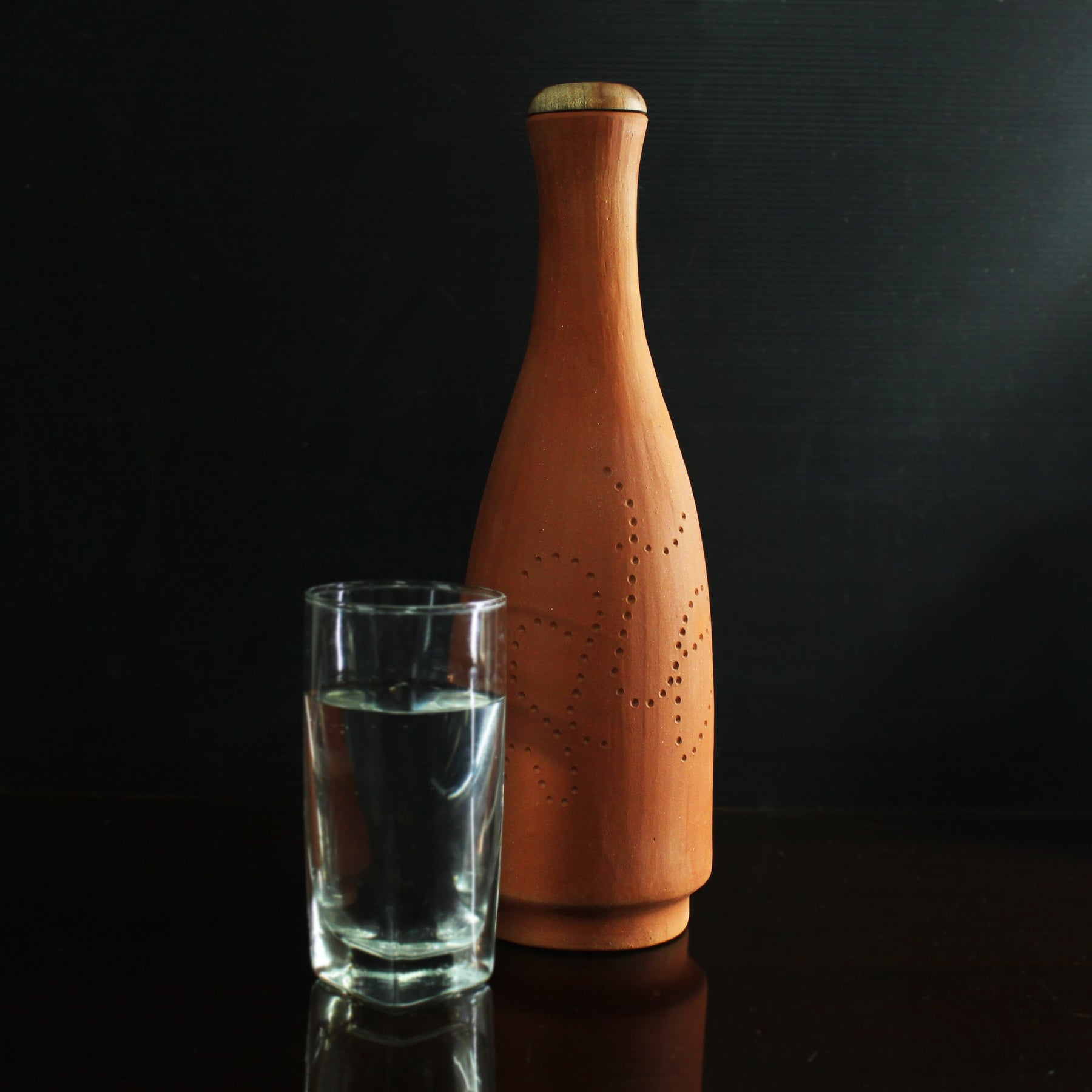 Handcrafted terracotta Water Bottle. Old utility product in modern form.It is perfect for all time use - water with proper temperature which is good for health.Perfect for home or office use with a different but natural taste and flavour of earthy & healthy water. Showcased picture is with actual product. Please don't use any washing agent to clean the product which will get absorbed in surface. Perfect to clean with only boiled hot water once in week. Regular wash is also essential before each refill. Approximate capacity : 1.0L Approx. Package Contains : 1 piece terracotta water bottle + 1 piece CORK cap This product is made of seasoned clay without impurities.
