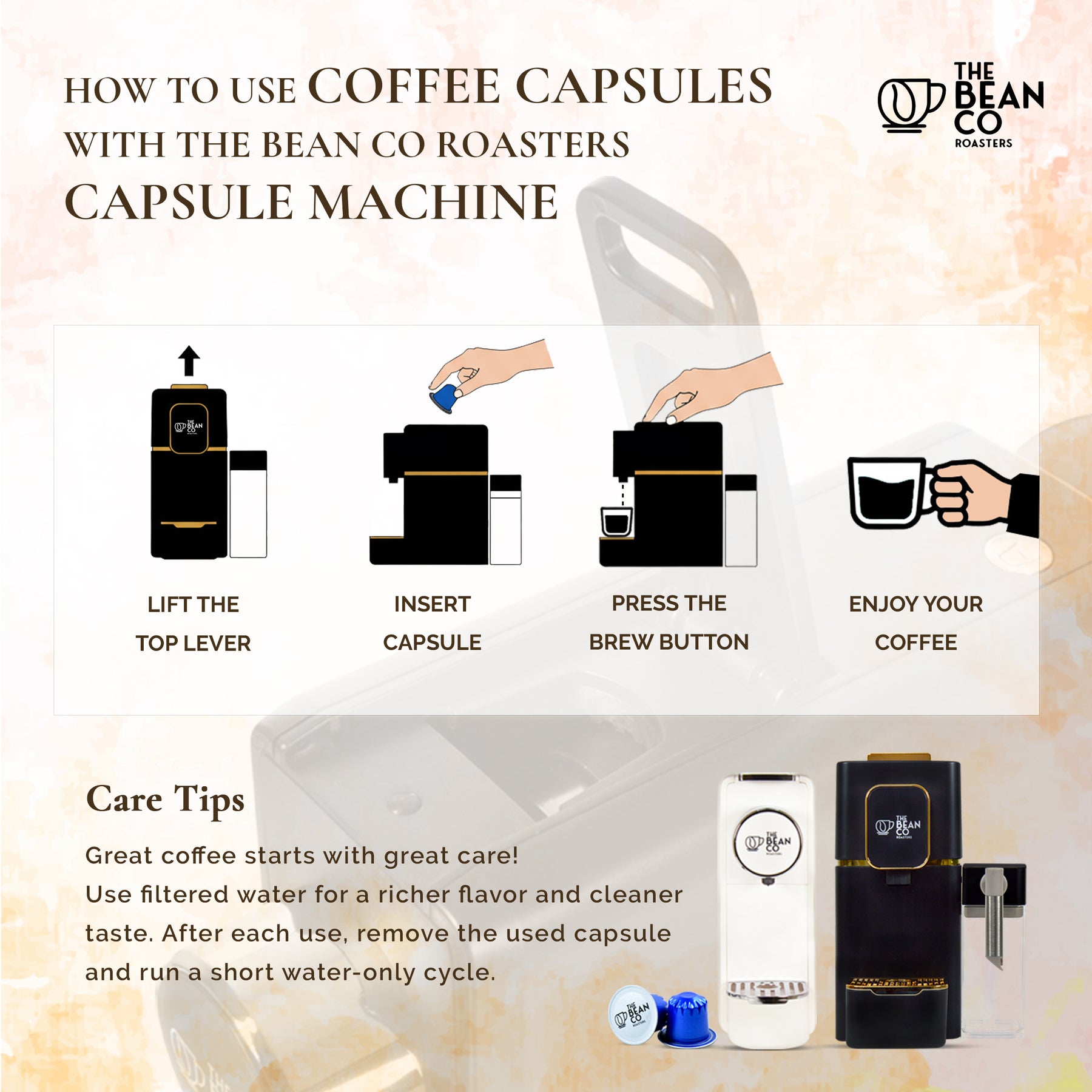 Care Instruction How to use : Fill water tank with fresh water. Turn on the capsule machine and wait for it to ready. Insert capsule into the slot. Place your cup under the coffee spout. Press brew/start or select coffee size. Wait for coffee to brew. Remove/dispose of used capsule.