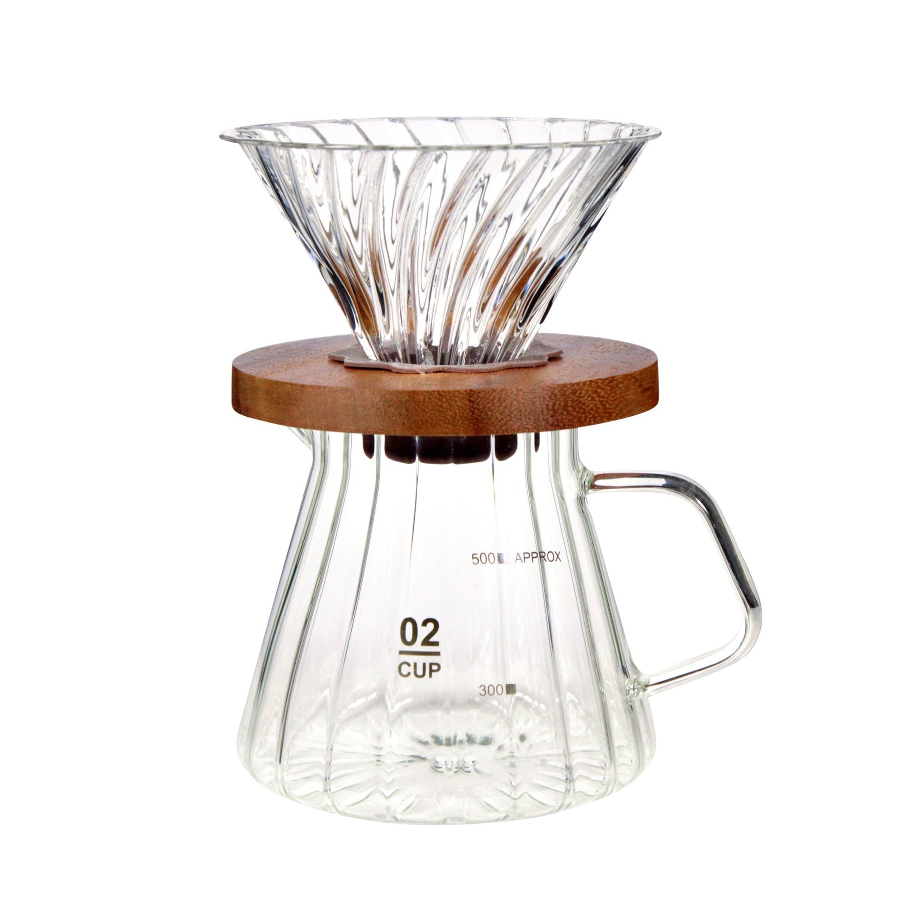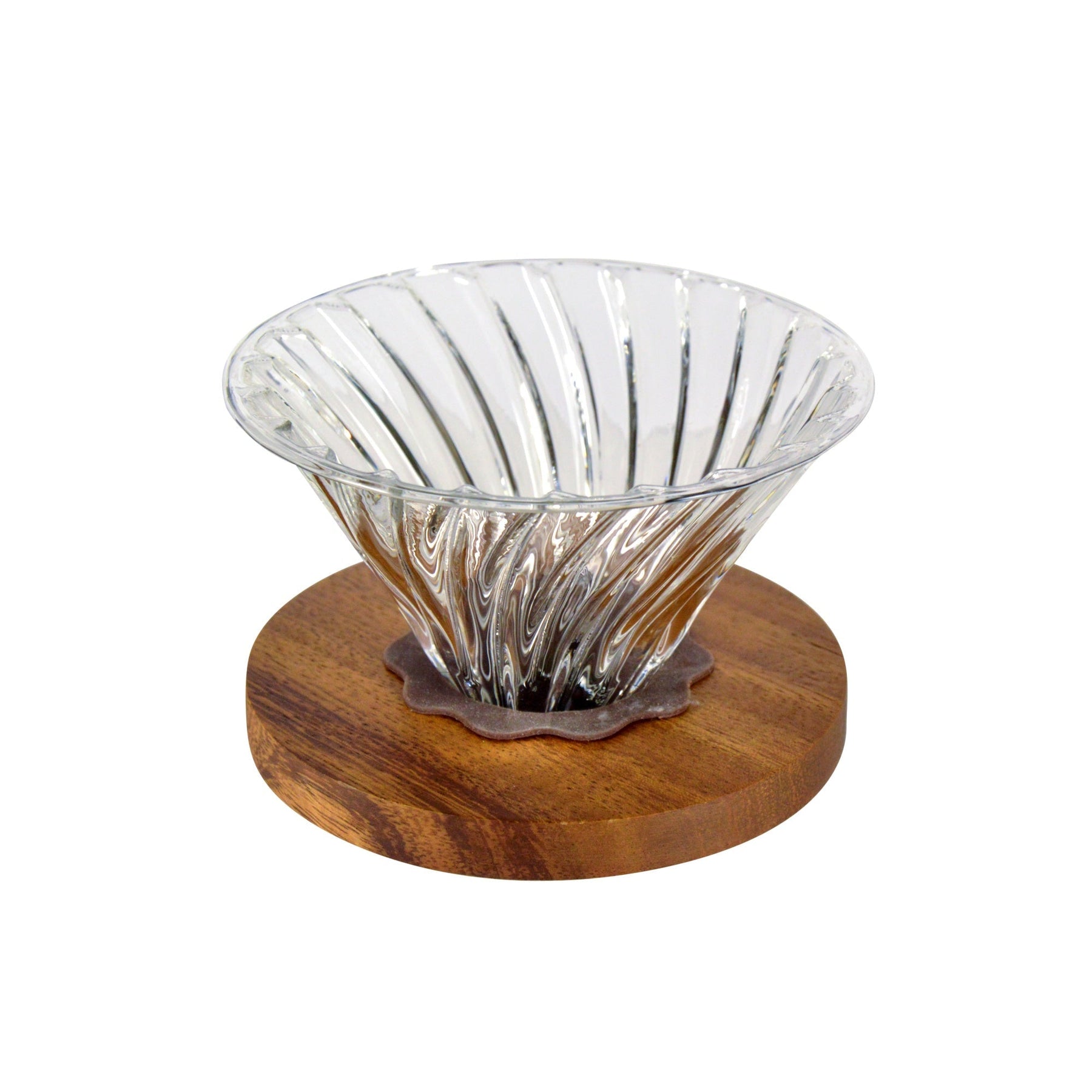 Coffee Dripper with Wooden Base: Enhance your coffee ritual with our precision-designed dripper. Made from glass with a wooden base our dripper is a perfect match for the pour-over carafe, enabling you to create a barista-quality brew at home. The precisely engineered perforations allow for optimal water flow, ensuring even extraction of coffee grounds. Compatible with various filters, it offers versatility while maintaining the simplicity of the pour-over method.
