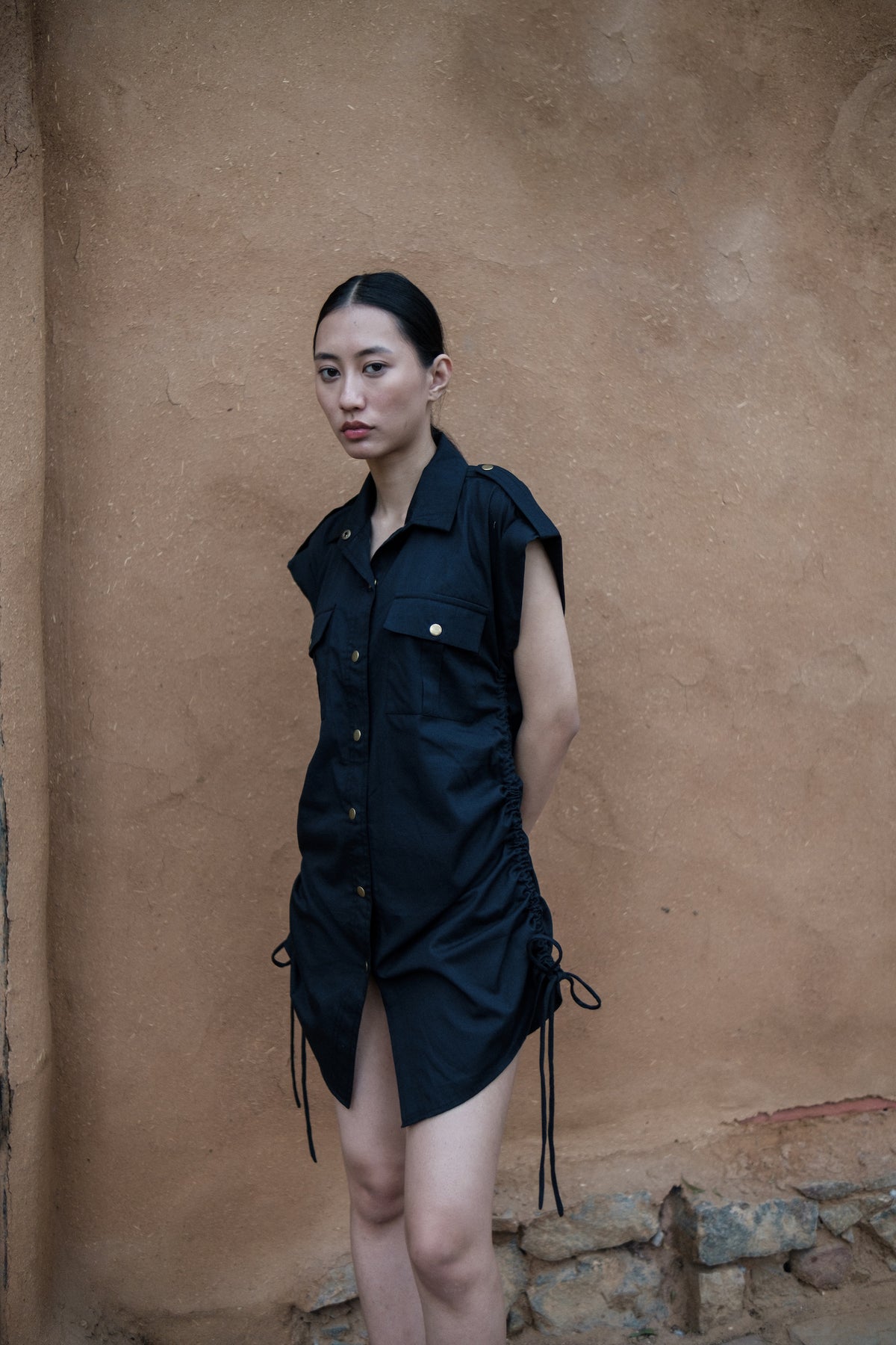 This versatile shirt can be worn as a shirt and as a dress. The side gathers lends an air of sophistication, while the inclusion of patch pockets infuses a street-inspired essence, achieving a harmonious balance of style and comfort.