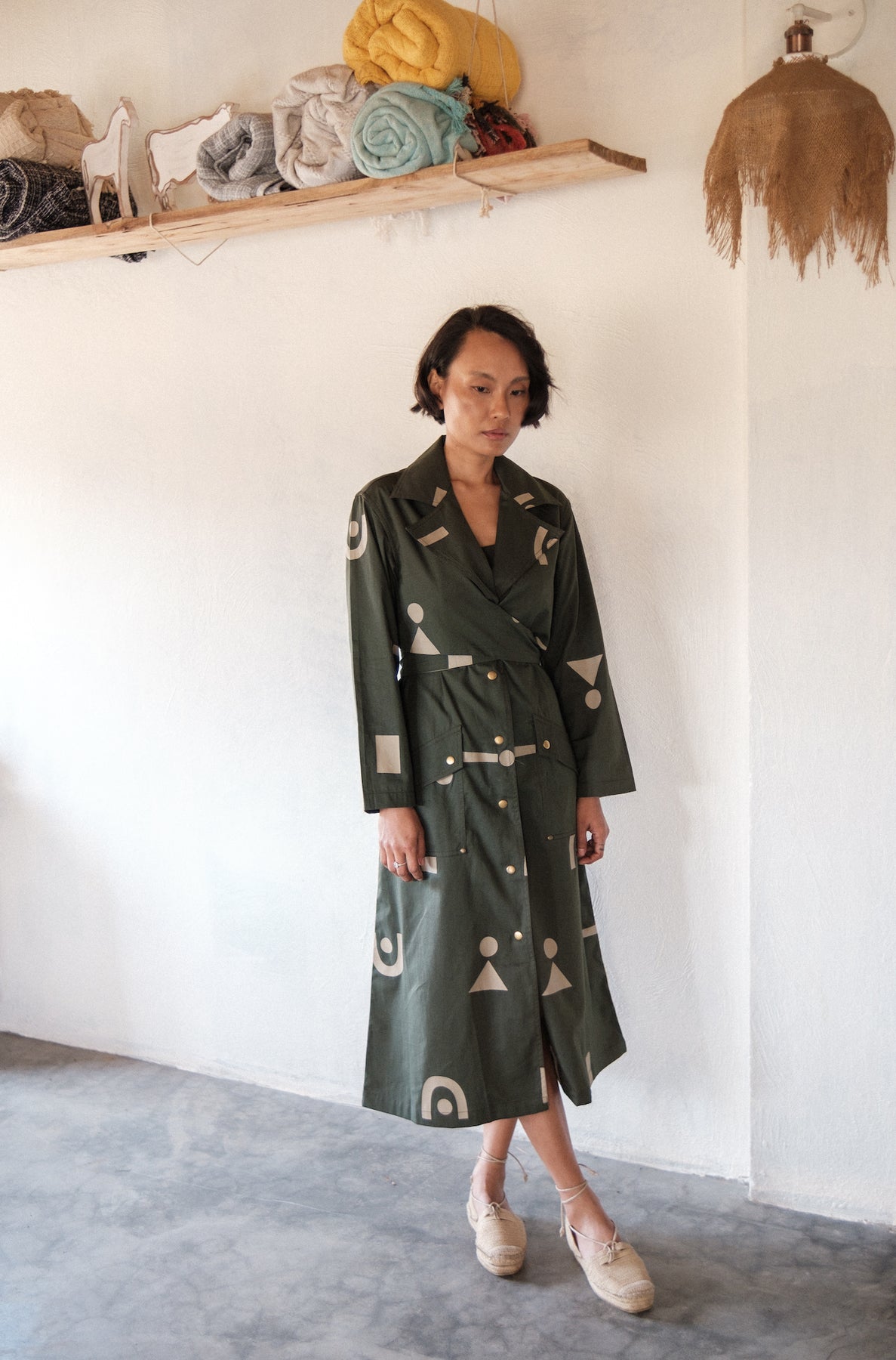 The Terra Tribe Deep Green Triangle Printed Copenhagen Trench
