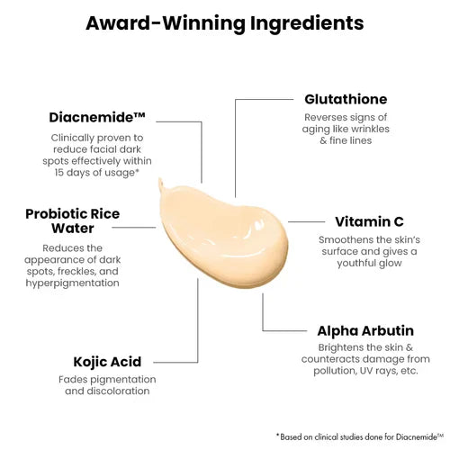 SKIN-LOVING INGREDIENTS: Unlike regular sunscreens, it includes ThriveCo's proprietary ingredient Diacnemide™, clinically proven to reduce facial dark spots effectively within 15 days of usage*. Probiotic Rice Water improves skin texture & tone by reducing the appearance of dark spots, freckles, and hyperpigmentation. Kojic Acid brightens the skin and counteracts damage from pollution, UV rays, and other harmful environmental factors. Glutathione reverses signs of aging like wrinkles & fine lines. Vit C & Alpha Arbutin improve skin elasticity & fade dark spots for a more youthful and luminous complexion. *Based on clinical studies done for Diacnemide™.
