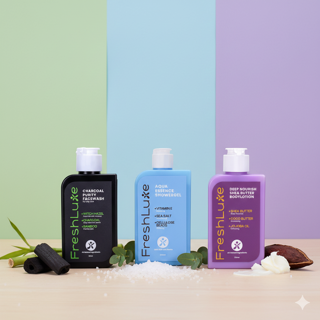 Your travel-ready essentials in one compact routine. Charcoal Facewash keeps skin feeling clean on the go, Aqua Shower Gel refreshes after long days, and Shea Body Lotion restores softness. Ideal for short trips, gym bags, and quick getaways.