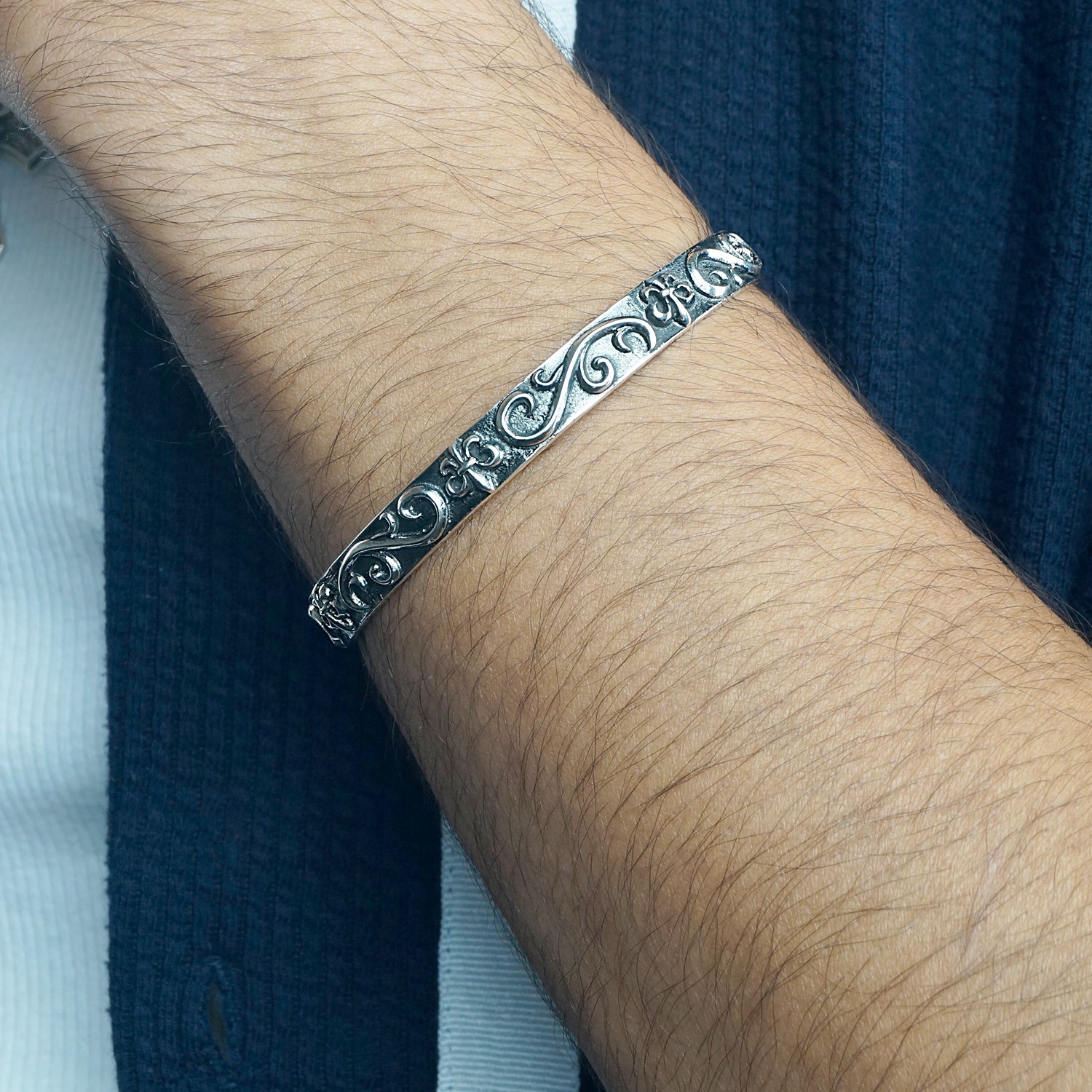 • The Vintage fleur de lis pattern cuff bracelet in 925 sterling silver is a stylish piece known for its unique designs and high-quality craftsmanship. A symbol of striking style, this 925 sterling silver cuff bracelet for men bears heraldic emblems from a bygone era. Whimsical, nostalgic, and powerful, this oxidized, adjustable cuff is for the discerning wearer.