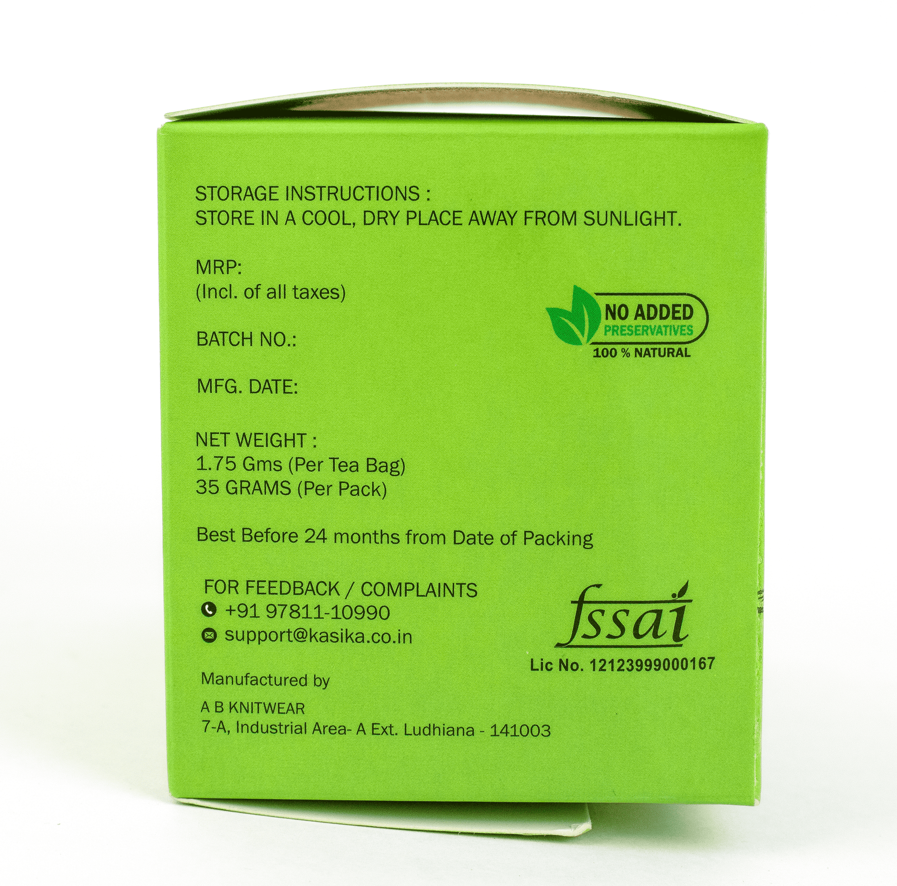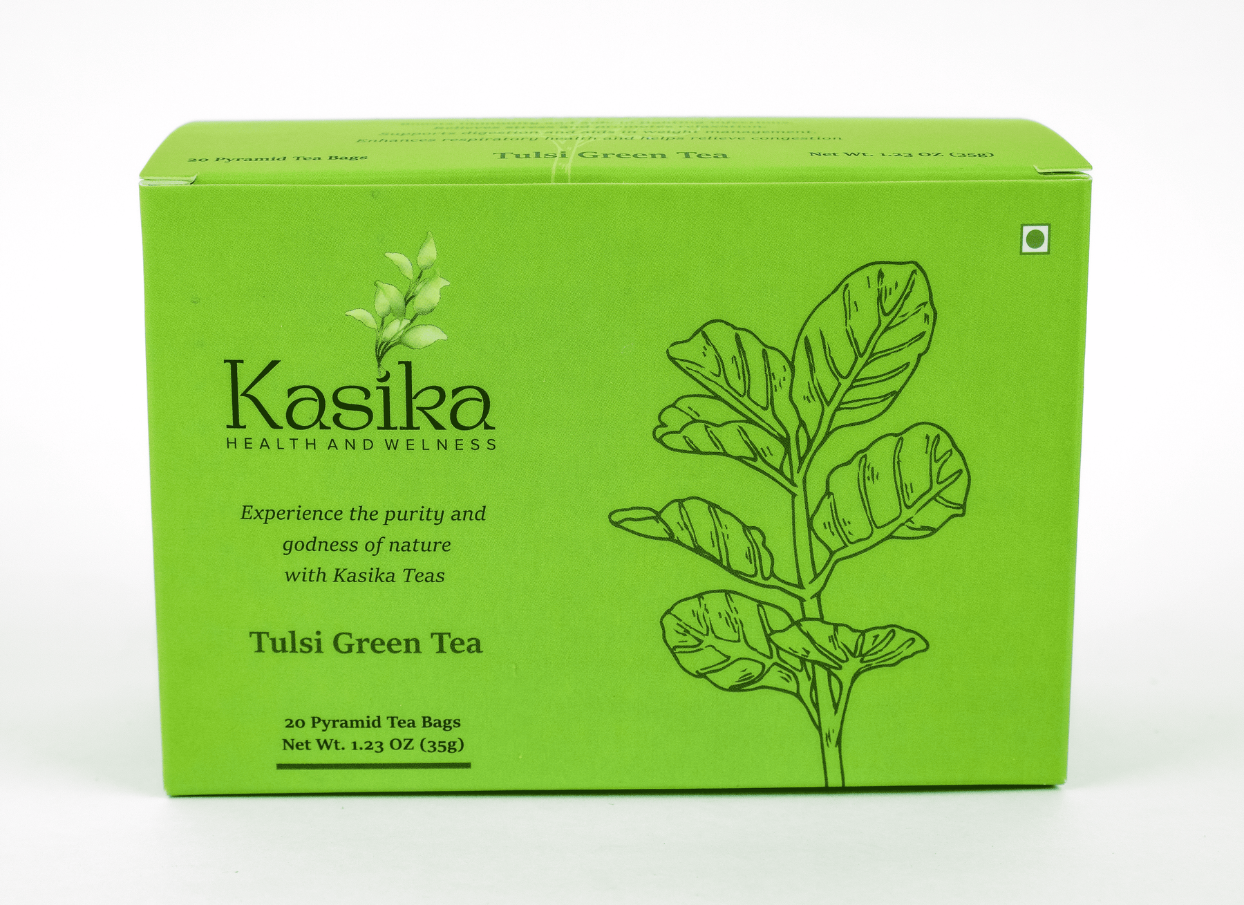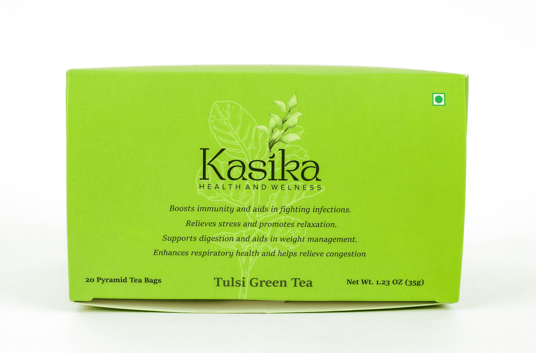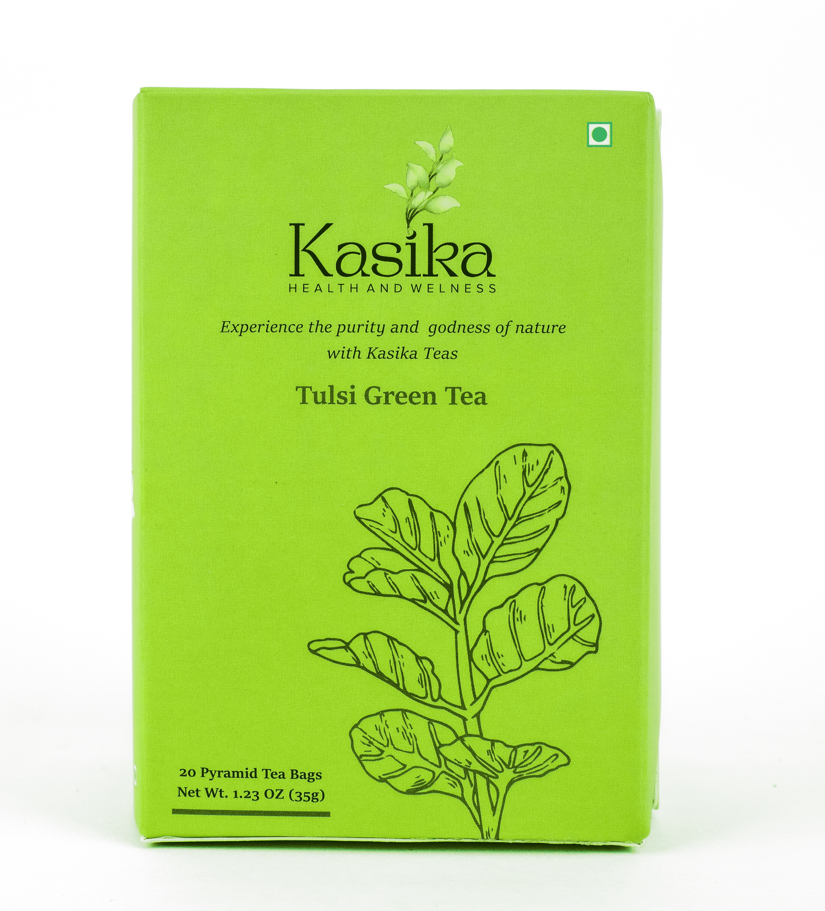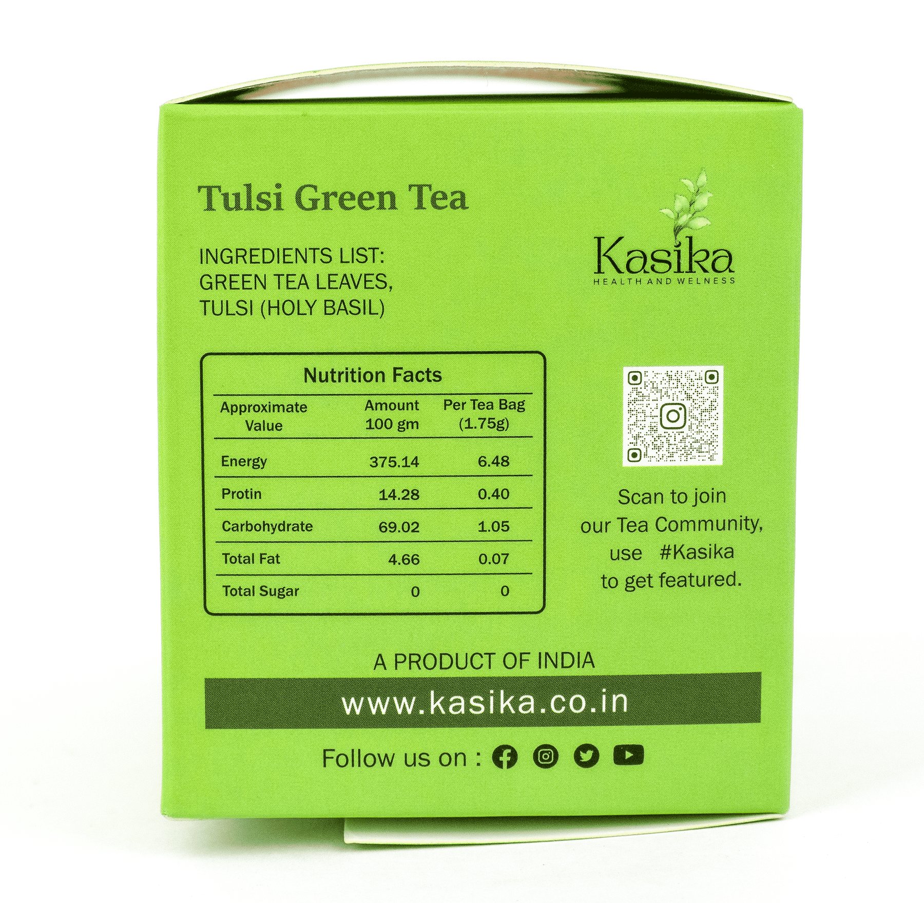 Introducing Kasika's Tulsi Green Tea, delicately encased within Pyramid Tea bags for an exquisite brewing experience. Crafted to perfection, each tea bag contains a harmonious blend of premium green tea leaves infused with the enriching essence of Tulsi, creating a revitalizing symphony of flavors.