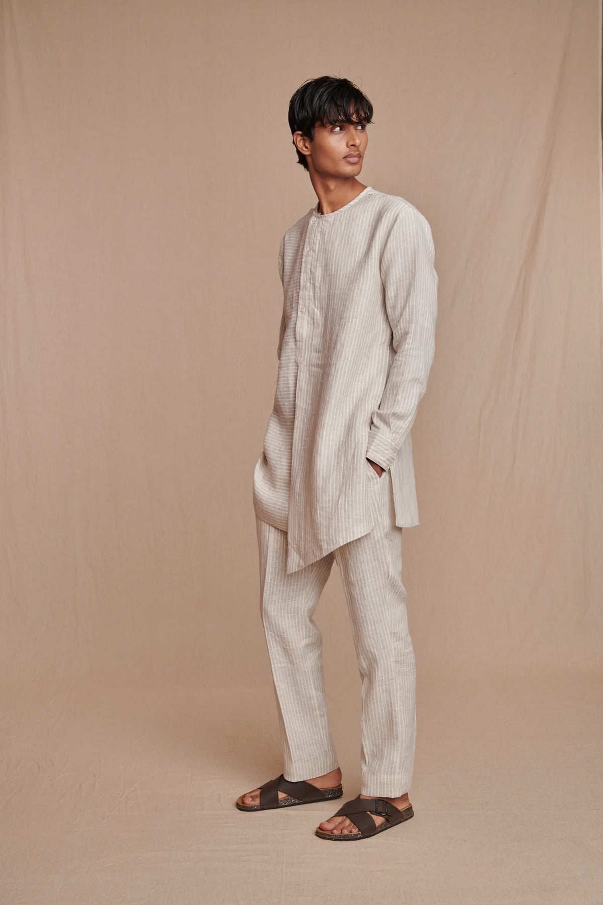 Crafted from 100% pure linen, this lightweight set pairs a side-opening kurta with pleated pyjama trousers — designed for comfort, structure, and softness in equal measure. The kurta features a round neck collar, mother-of-pearl buttons, and directional stripe detailing that flows into a distinctive angled placket. The pants are cut with a relaxed fit, front pleats, and a partially elasticated waistband — balancing ease with intention. Worn together, they offer a quiet uniform for warm days, festive moments, and everything in between.A traditional silhouette, thoughtfully updated for today.