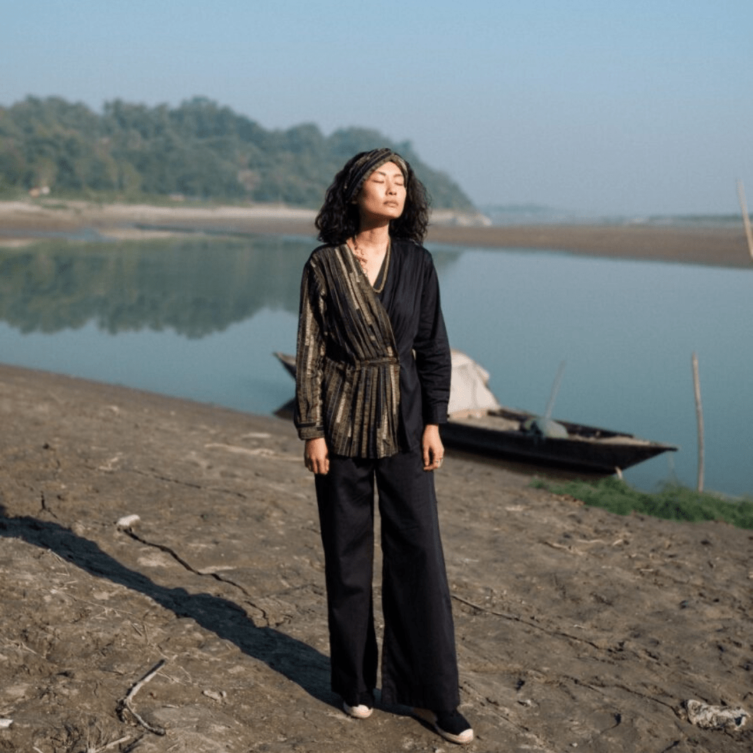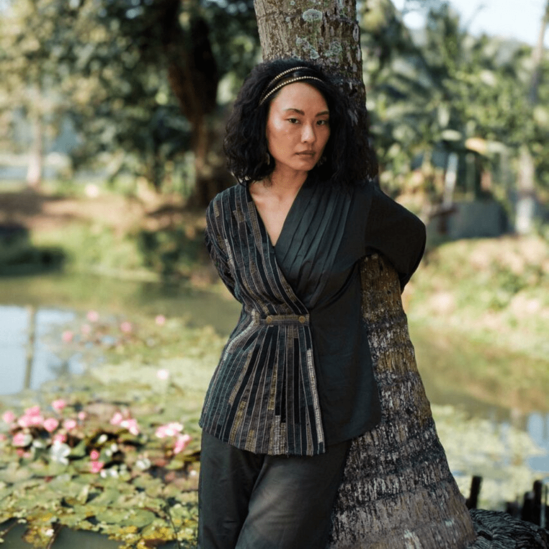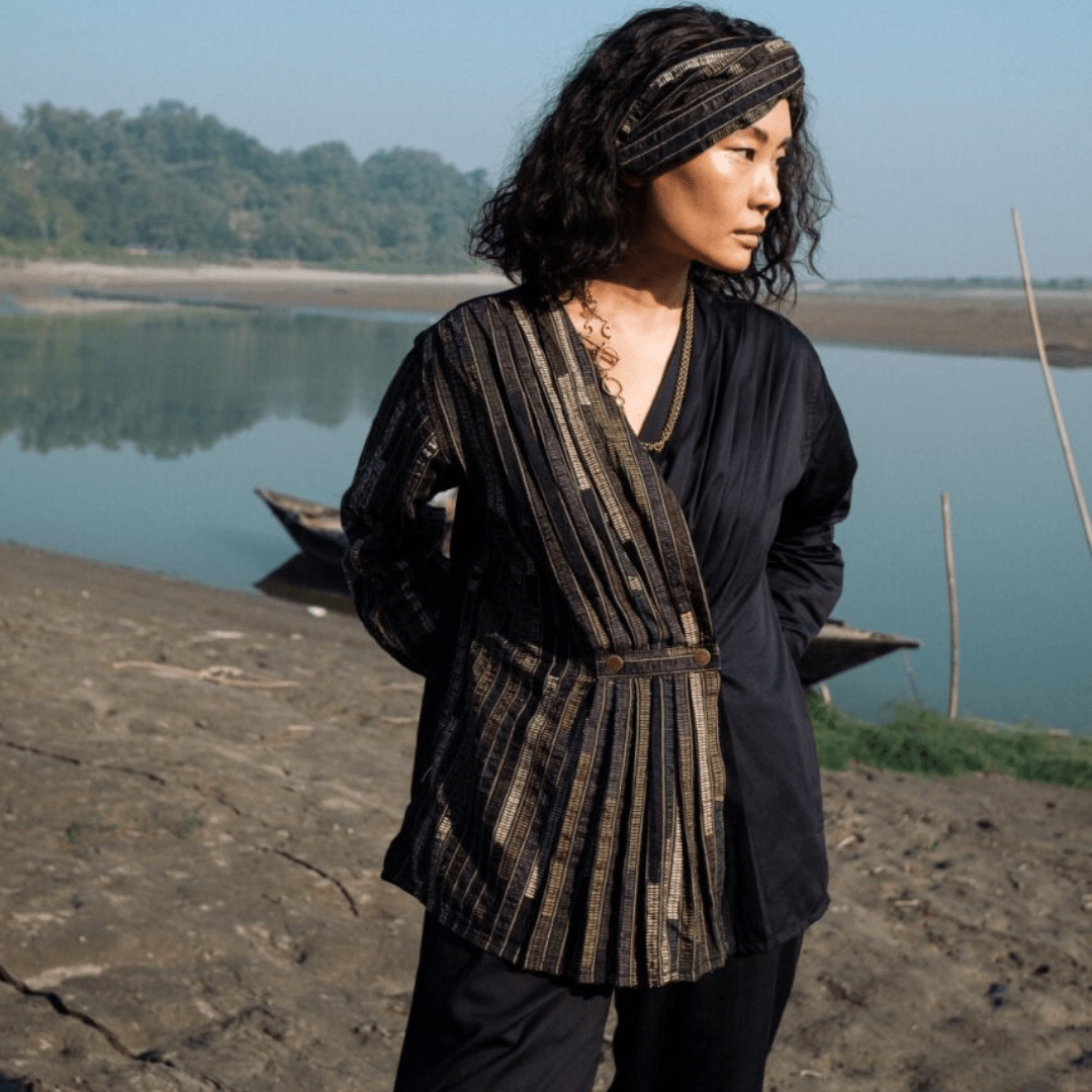 This top featuring pleats designed from upcycled fabric, made using post production waste, pairs perfectly with our flared pants. Our garments are dyed using pigments that do not cause any major harm to the environment in any manner. The garment is made from hand woven upcycled fabric and so the color might vary slightly for each batch. Peta approved vegan/Plant based clothing. For customization, please reach out to us.