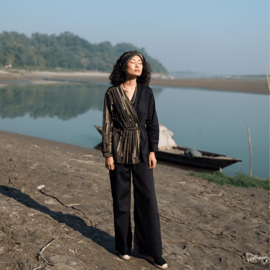 The garment is made from hand woven upcycled fabric and so the color might vary slightly for each batch.