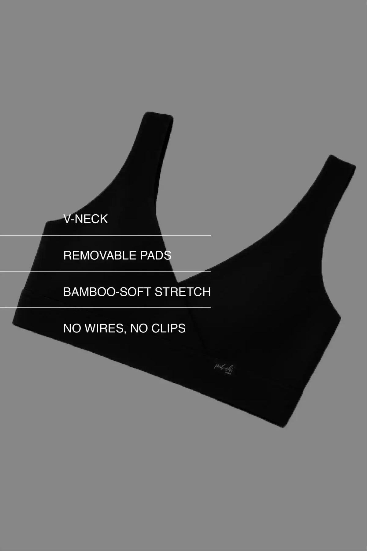 Fit: Wire-free · Pull-on · Removable Pads · Second-skin soft