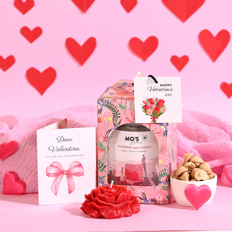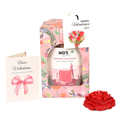 Mo's Bakery Valentines Day Pink Gift Box with Raspberry Cookies, Rose Flower Candle & Customisable Card | Healthy Valentines Day Gift