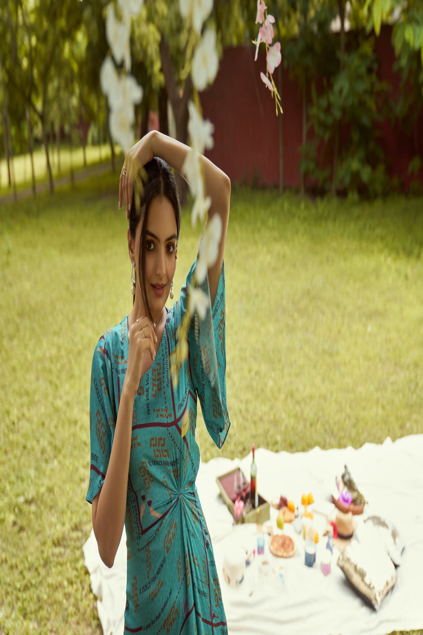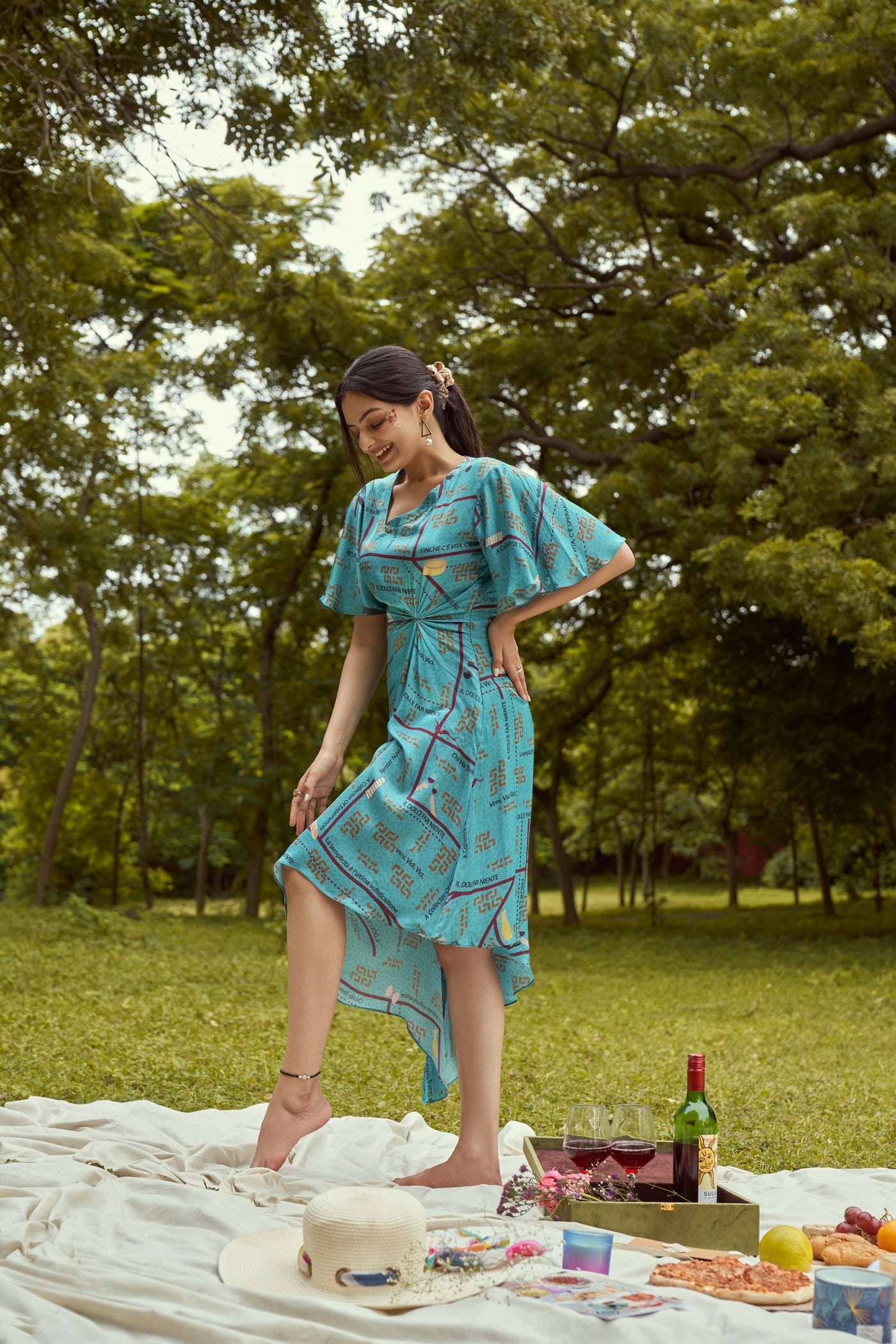 Experience the elegance of our Venice Twisted Printed Dress, a true masterpiece for your wardrobe. This flowy digital-printed dress is a work of art, featuring delicately draped twisted knots at the high waist and above-elbow-length circular cape flared sleeves. The side drop-down V-neckline adds a touch of allure to this captivating ensemble.