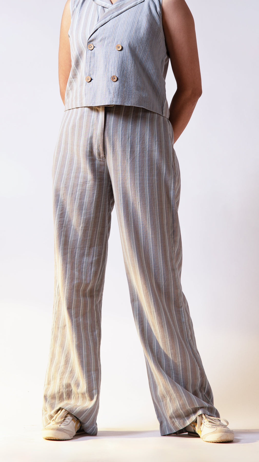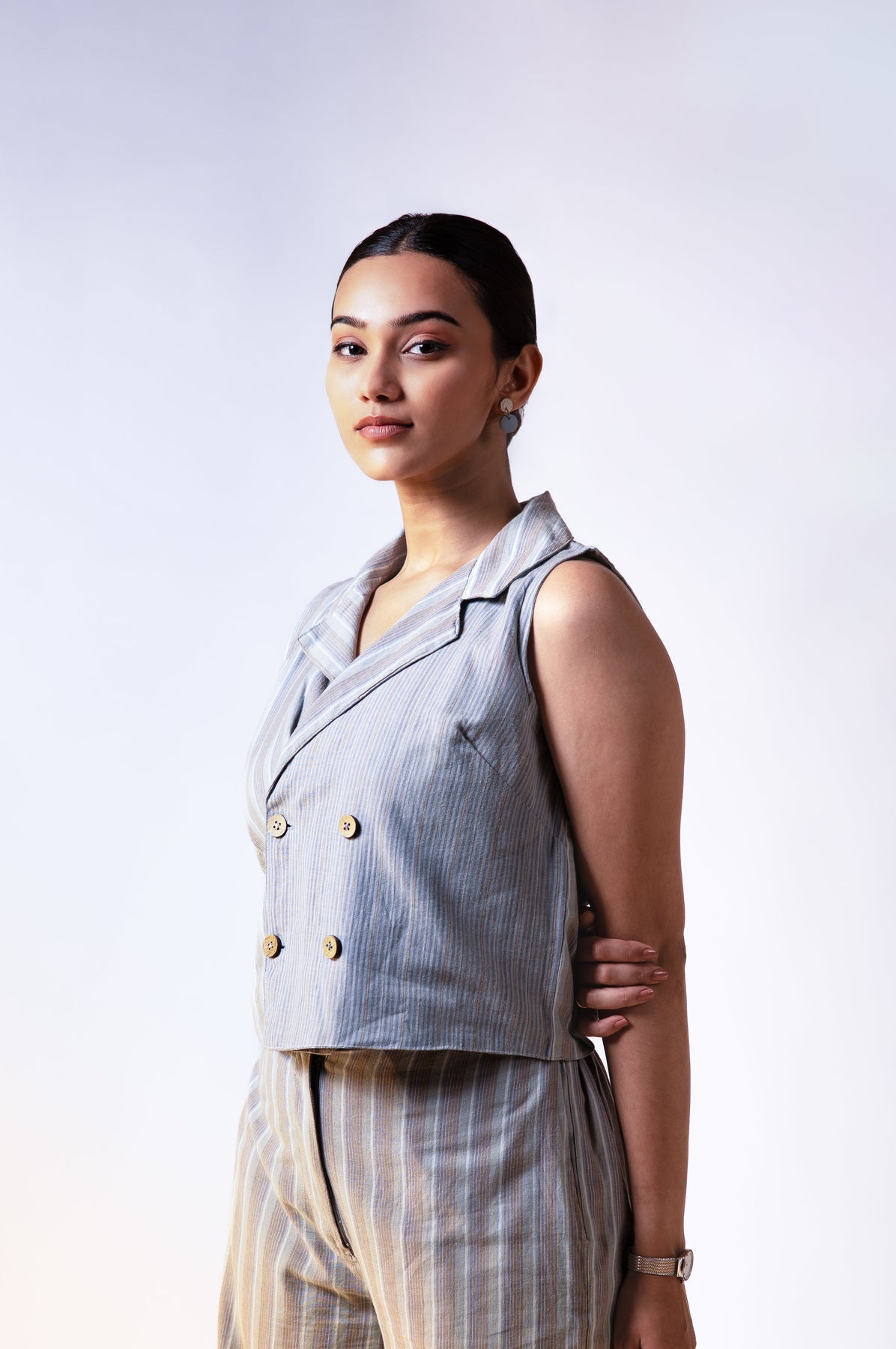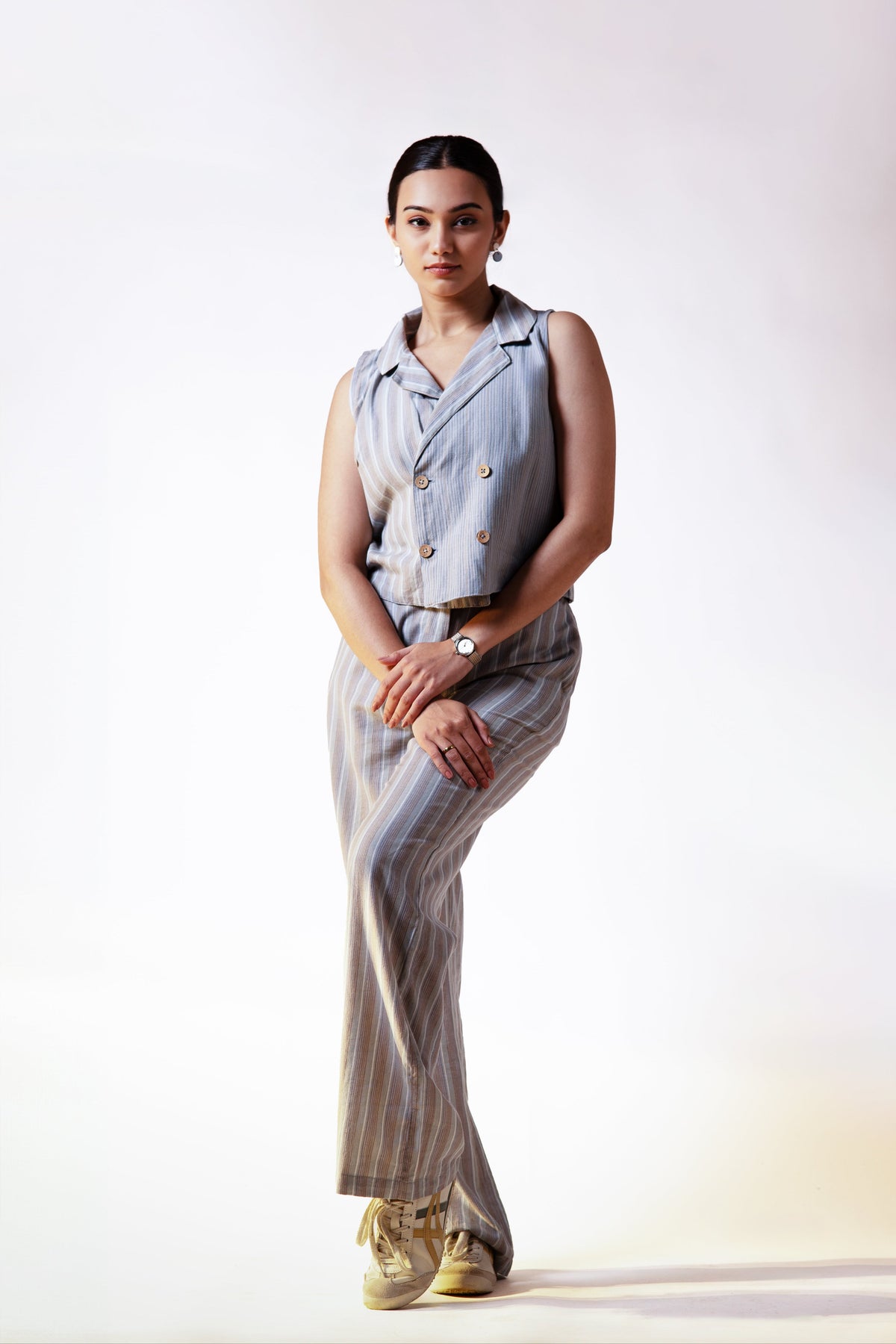 - Delicate stripes in cool, soothing tones lend a timeless charm to the outfit. A versatile weave that transitions seamlessly from daytime chic to evening sophistication.