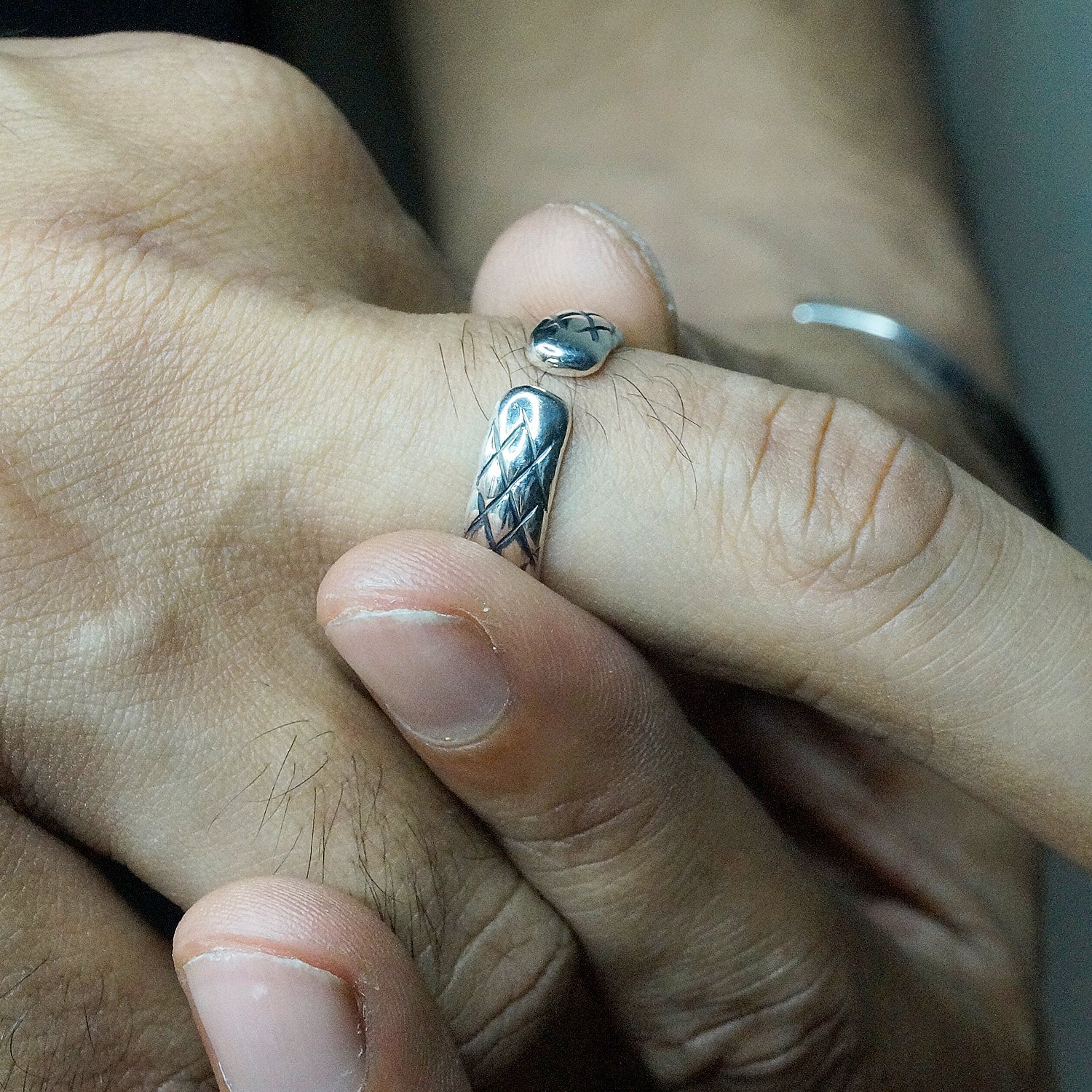 • Forged in oxidized 925 sterling silver, this adjustable ring is a perfect accessory for the modern wearer and his untamed boldness.