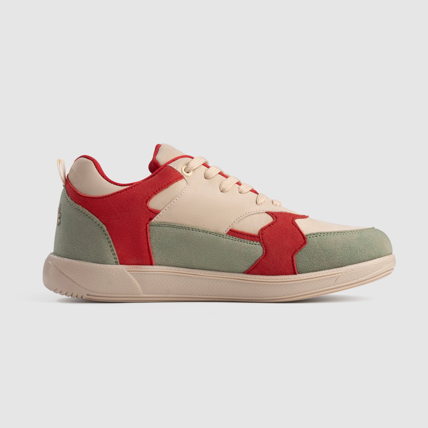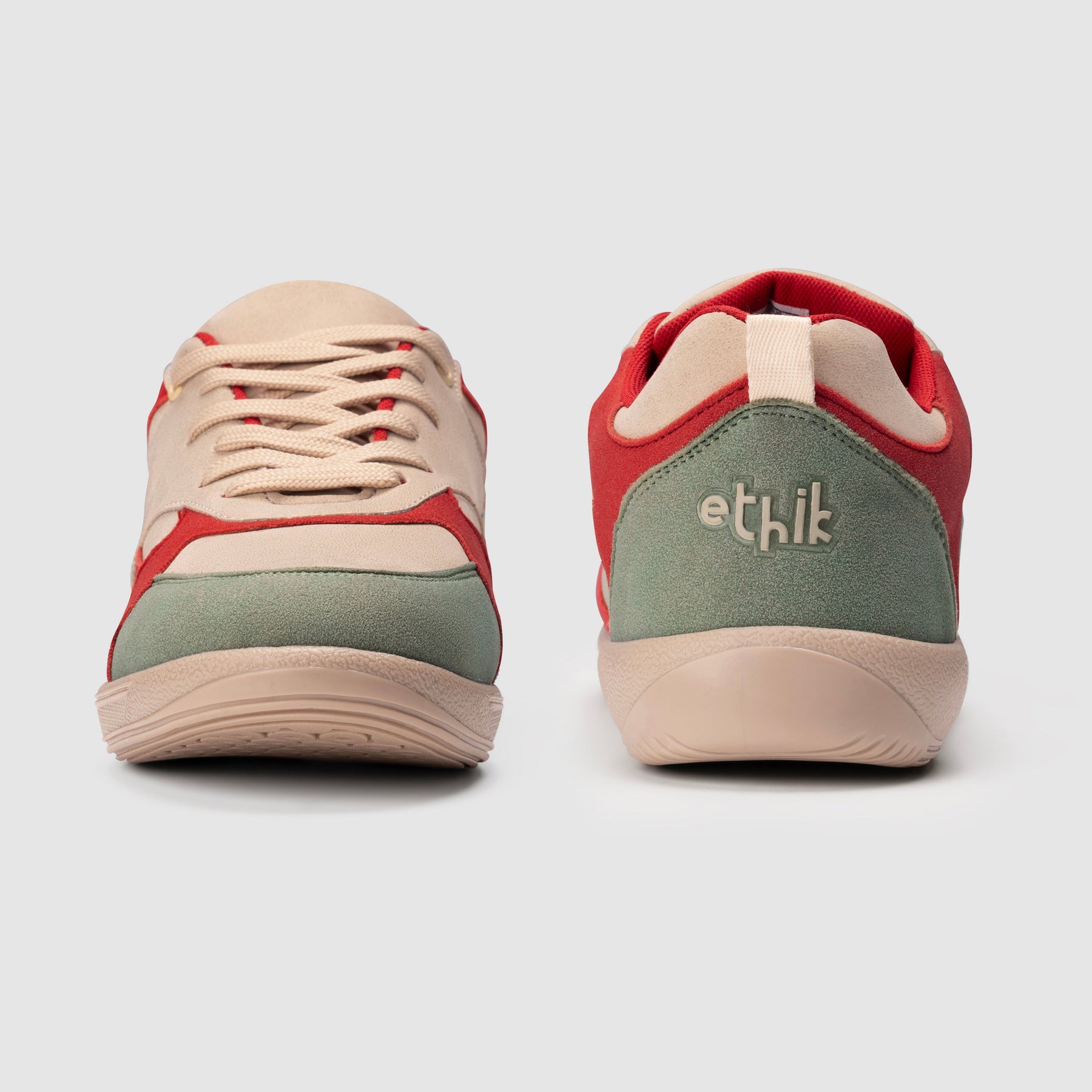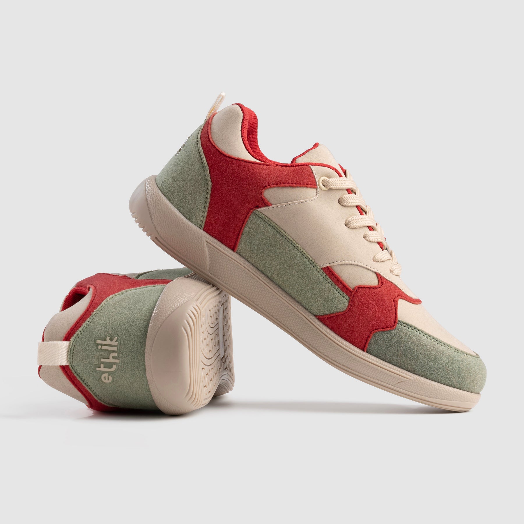The offcode PEPPER Sneakers by Ethik combine style, comfort, and sustainability. Featuring a beige base with bold red overlays and muted green accents, these sneakers make a statement with every step. The upper is crafted from responsibly selected synthetic suede and vegan leather, offering layered textures and crisp paneling for a distinctive look. Inside, breathable mesh lining ensures ventilation, while the cushioned PU footbed and lightweight TPR sole provide all-day comfort and support. Each pair comes with an extra set of laces to customize your style effortlessly. Designed for everyday wear, the PEPPER adapts seamlessly to city streets, campus life, and casual outings.
