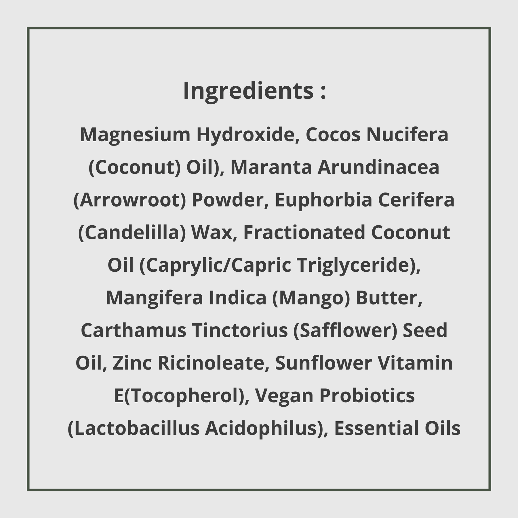 Magnesium Hydroxide, Coconut Oil, Arrowroot Powder, Candelilla Wax, Fractionated Coconut Oil, Mango Butter, Safflower Oil, Zinc Ricinoleate, Sunflower Derived Vitamin E, Vegan Probiotics, Pure Vanilla Absolute.