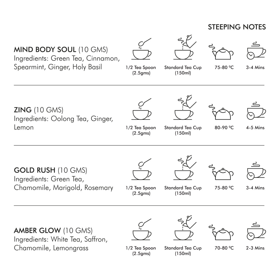 Wellness Tea Sampler Pack - Gold Rush, Mind Body Soul, Zing, and Amber Glow. Each blend is crafted from 100% natural whole leaf tea with natural ingredients. Enjoy the flavors of nature in this pack of 4 delightful teas.