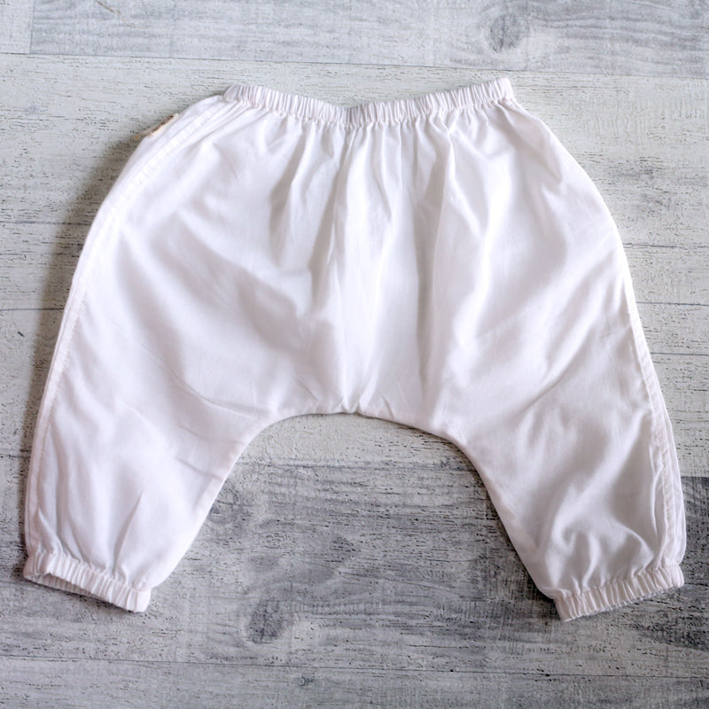 1 x pants: 100% organic cotton undyed in white colour. Elasticated waistband and bottom hem. Ideal for sensitive skin.