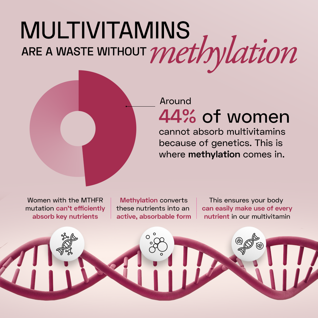 Your nutritional needs aren't generic. Your multivitamin shouldn't be either. Nearly 44% of women carry a genetic variation that can limit how effectively certain vitamins are absorbed. Which is why our formula delivers nutrients in pre-activated, methylated forms your body can use immediately. The result is superior absorption for benefits like sustained energy, beauty support, and balanced hormonal health.