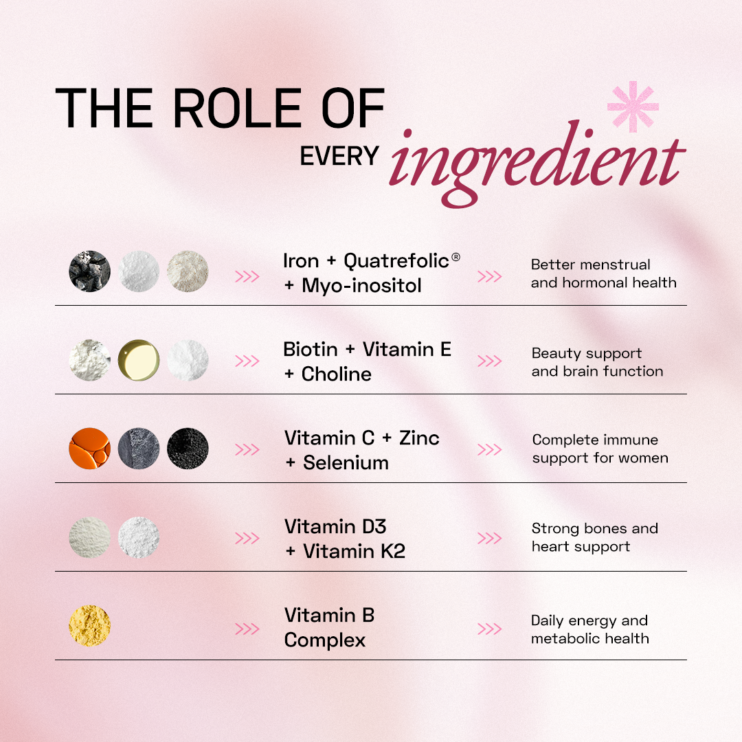 Our formula ensures everything you take in is efficiently absorbed. This ensures the gradual buildup of real benefits, with a formula curated for the modern woman: