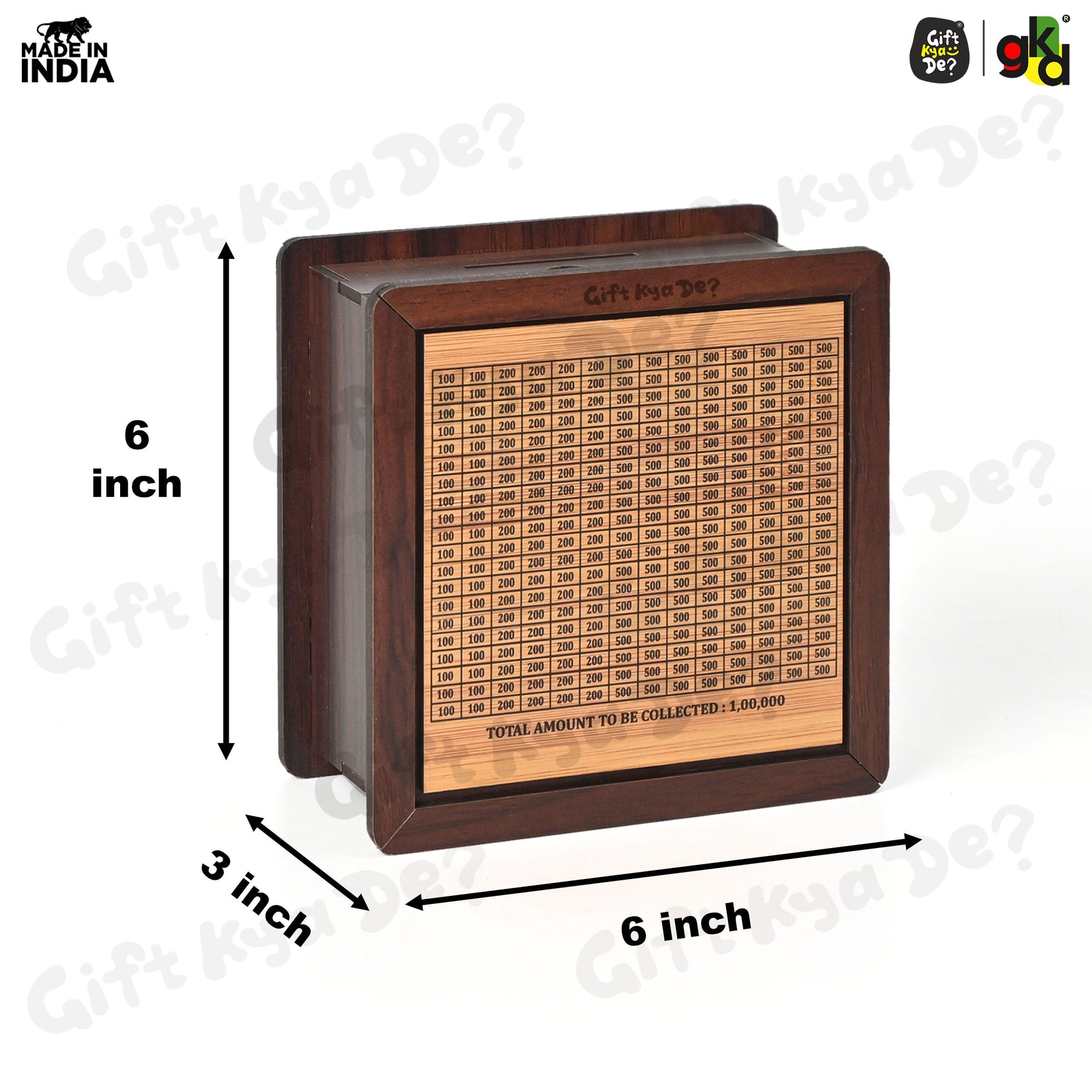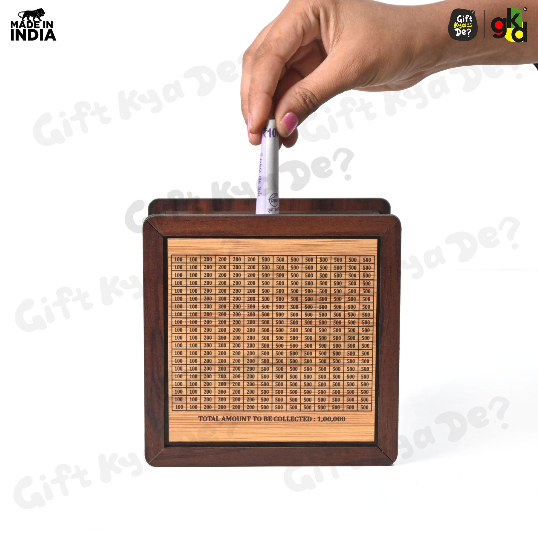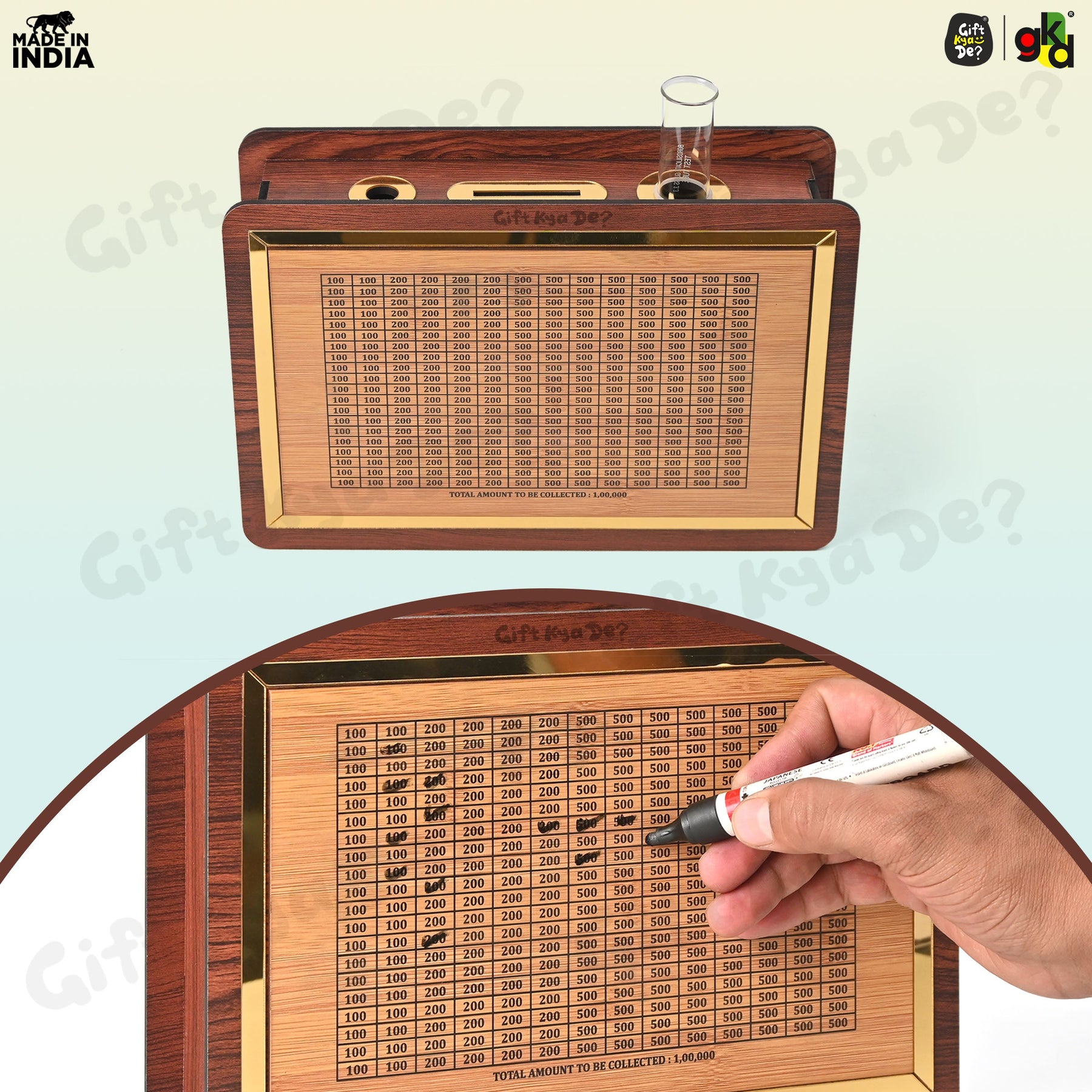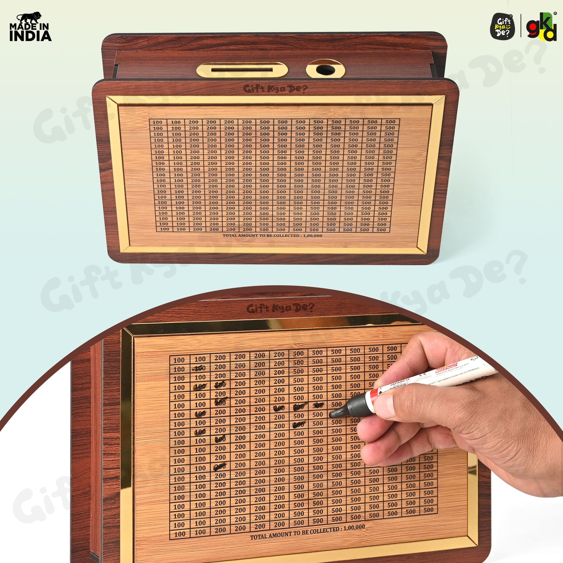 Introducing the Gift Kya De Wooden Piggy Bank, a creative and interactive way to track savings! Designed with pre-marked denominations like ₹50, ₹100, ₹500, this unique wooden money bank allows you to cut off the amounts as you insert cash, making it a goal-oriented saving experience. The total savings goal is set at ₹1,00,000—an exciting challenge for kids and adults alike.