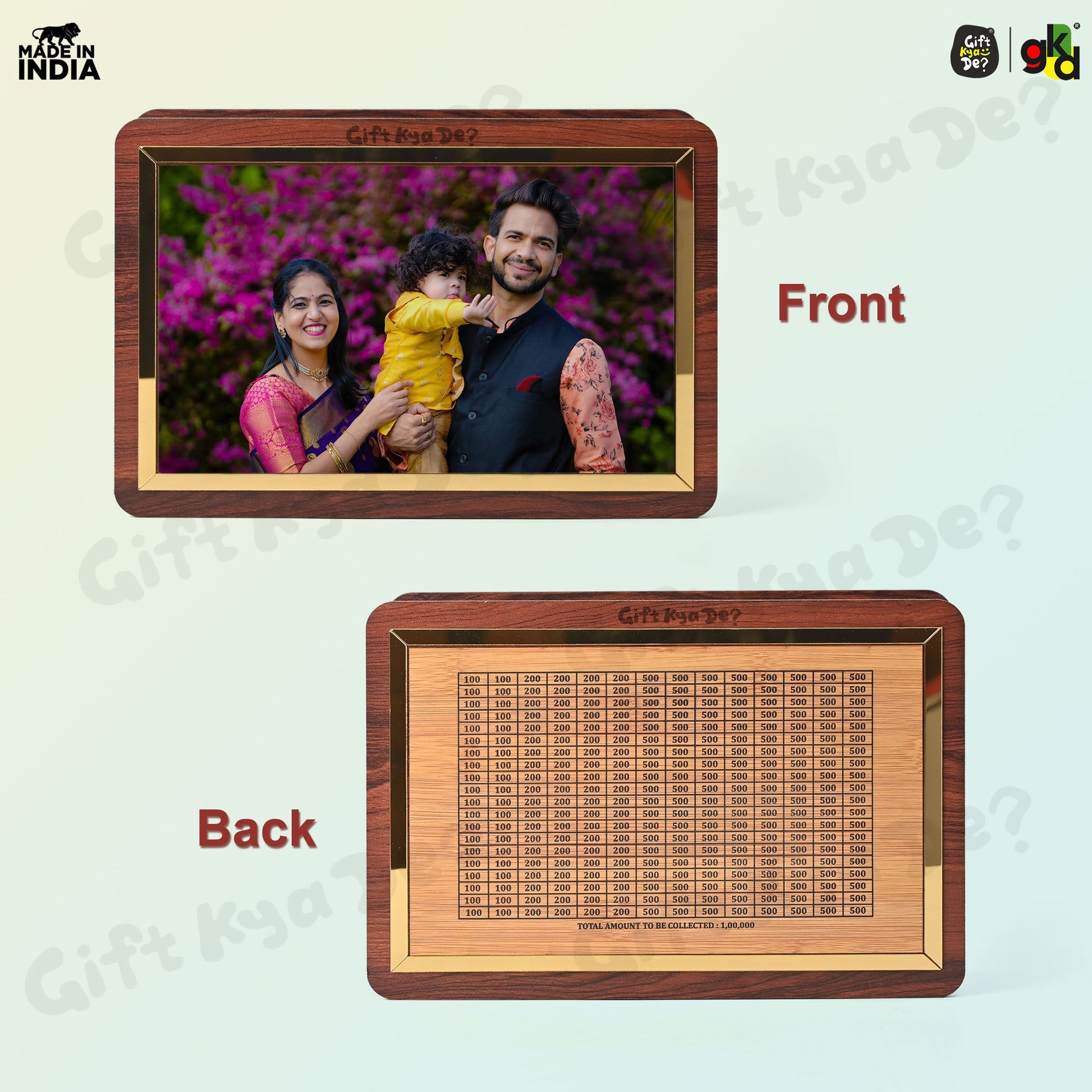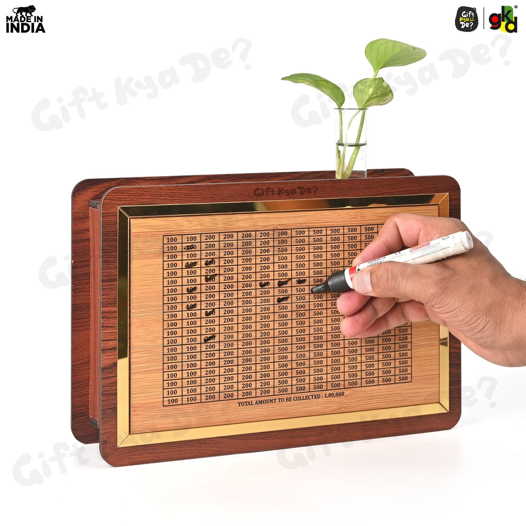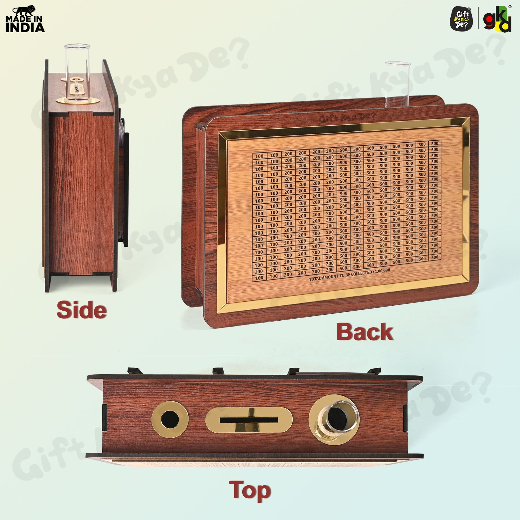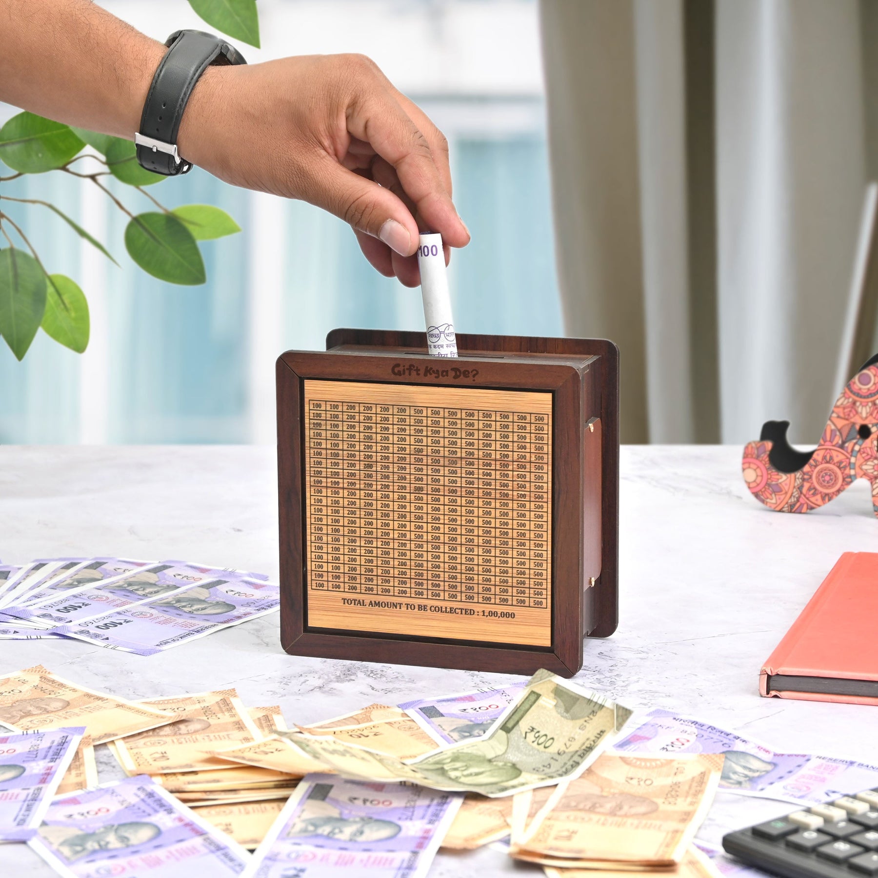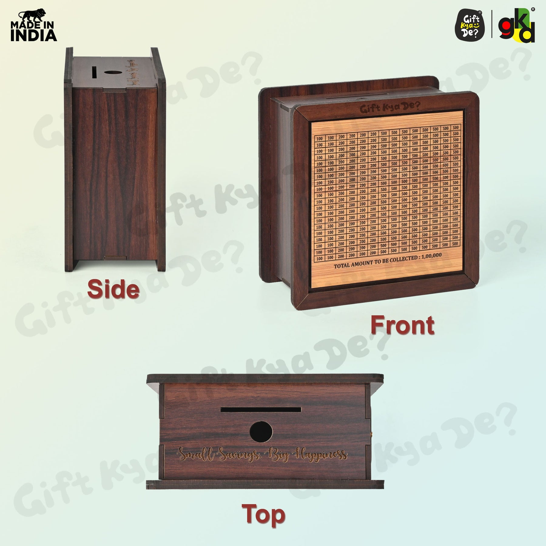 Introducing the Gift Kya De Wooden Piggy Bank, a creative and interactive way to track savings! Designed with pre-marked denominations like ₹50, ₹100, ₹500, this unique wooden money bank allows you to cut off the amounts as you insert cash, making it a goal-oriented saving experience. The total savings goal is set at ₹1,00,000—an exciting challenge for kids and adults alike.