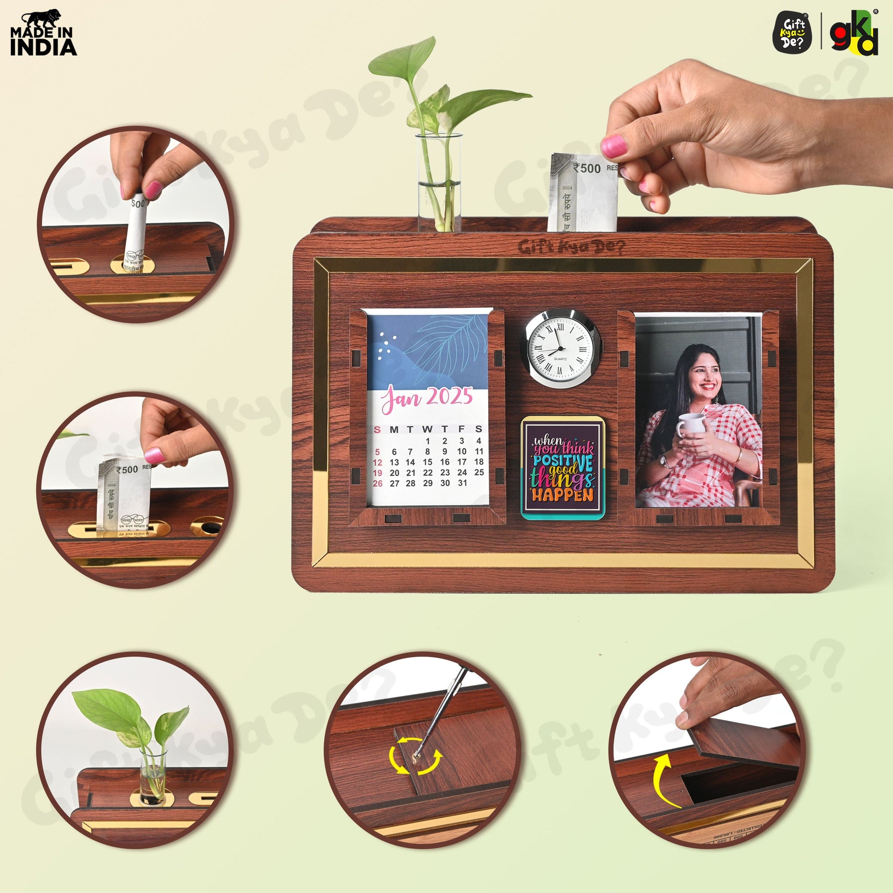 Customizable Design (Select Variants): Get a personalized touch with a photo-printed on piggy bank or a premium version featuring a planter, calendar, and clock—perfect for gifting and home decor.
