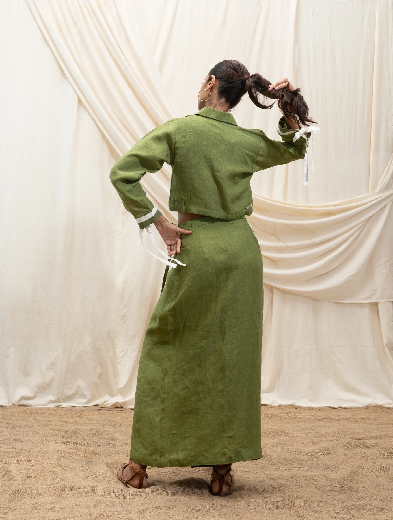 A stylish wrap-around skirt with an inside button fastening and an additional hook-and-tie closure for a secure fit. The front showcases our signature stamp embroidery, while the back features the Akashi logo in Hindi, adding a contemporary touch. Designed for both style and functionality, the skirt also includes a pocket for convenience.