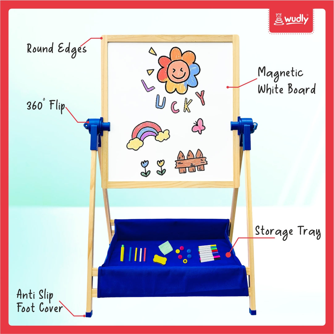 Wudly 3-in-1 Creative Easel Board with Chalkboard, Whiteboard, Storage Tray, Educational Kids Art Station