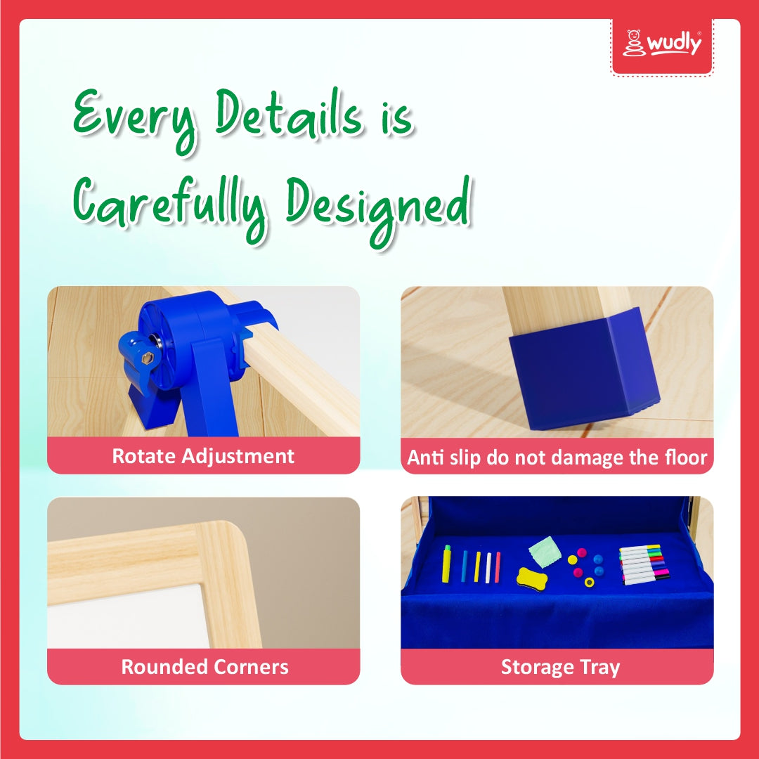 Unleash your child's creativity with this versatile 3-in-1 Creative Easel Board! Perfect for learning and artistic expression, this thoughtfully designed easel features both a chalkboard and a whiteboard surface, along with a convenient storage tray. The sturdy wooden frame with blue accents provides excellent stability, while the adjustable board angles ensure comfortable use. The spacious blue storage tray keeps chalk, markers, and other art supplies organised and within easy reach. Whether it's practising ABCs, creating colourful drawings, or engaging in imaginative play, this easel board serves as an excellent educational tool. Its dual-sided design allows for seamless transitions between different activities, making it an ideal choice for homes, playrooms, or learning spaces. The combination of functionality and durability makes this easel board a wonderful addition to support your child's developmental journey through art and education.