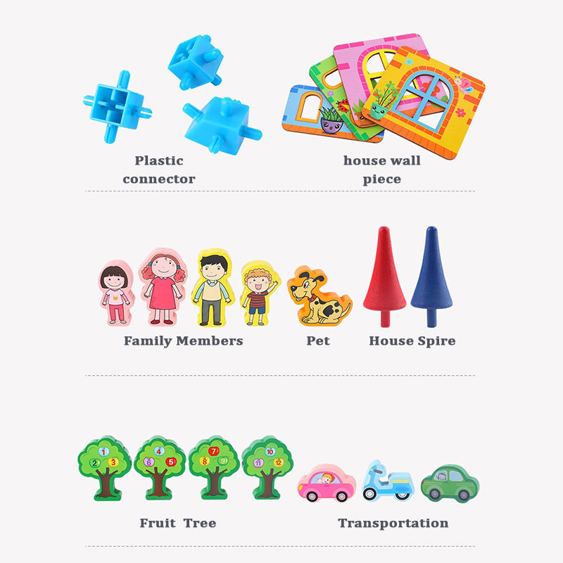 Spark your child's imagination with this charming wooden architectural building blocks set. This delightful castle-themed construction toy features multiple stories with colourful details, including a clock tower, red and blue turrets, and decorative windows. The set comes with adorable wooden character figures, a miniature car, and tree accessories to create an enchanting play scenario. The building blocks are connected using sturdy blue connectors, making assembly straightforward for little hands. The thoughtful design incorporates various architectural elements like arched doorways, balconies, and a picket fence, helping children learn about basic construction concepts while playing. The pastel colour scheme in pink, blue, and natural wood tones creates an appealing aesthetic that will complement any playroom. Perfect for children who love creative construction play, this set encourages spatial awareness, fine motor skills, and imaginative storytelling. The versatile pieces allow for multiple configuration possibilities, ensuring hours of engaging playtime.
