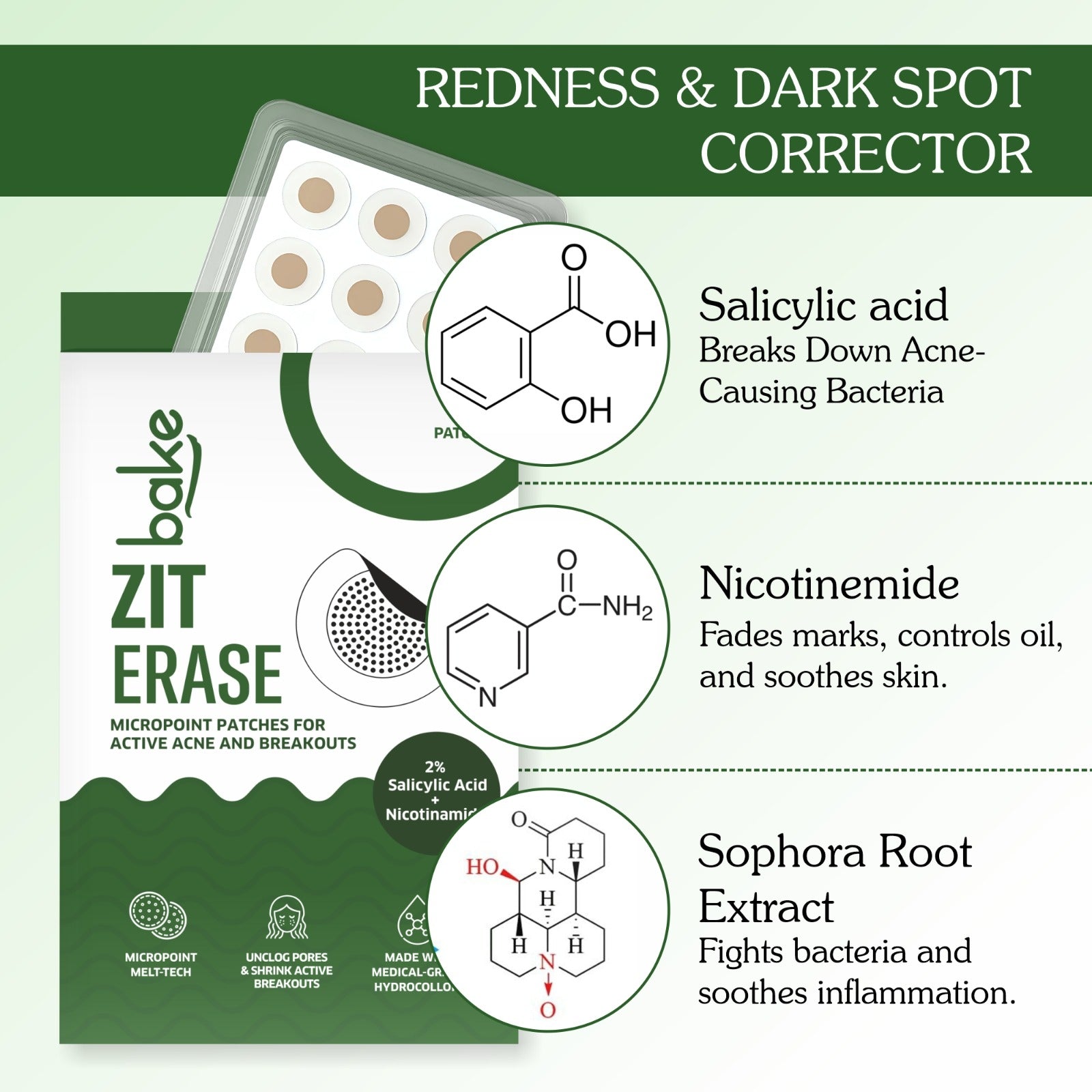 BAKE Zit Erase Micro point Patches are targeted skincare solutions formulated to treat active breakouts at the early stage. Each patch is embedded with 176 melt-tech microneedles that painlessly dissolve into the skin, delivering acne-fighting actives exactly where they are needed. Powered by 2% Salicylic Acid and Niacinamide, this dual-action blend helps to unclog pores, reduce inflammation, and minimize the appearance of acne. The hydrocolloid base not only protects the blemish from external bacteria but also helps to absorb pus, oil, and impurities from within. Designed to penetrate the epidermis, these patches address pimples before they fully form, speeding up recovery and reducing the likelihood of scarring. The transparent and ultra-thin format makes them suitable for both day and night use, even under makeup. Ideal for individuals prone to hormonal or stress-related breakouts, these dermatologist-recommended patches are suitable for all skin types. The formulation is free from fragrance, parabens, and sulfates, making it gentle yet effective for sensitive skin. Each box includes 9 single-use patches, individually packed for optimal hygiene and convenience. Whether used as an emergency spot fix or part of a consistent acne-control routine, these patches deliver fast, visible results. Formulated with clinical precision, they offer a non-invasive alternative to topical acne treatments. BAKE Zit Erase Patches are essential for those seeking a science-backed solution to manage and calm breakouts at their source.